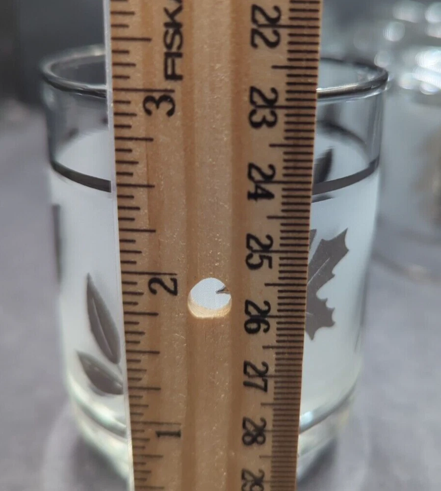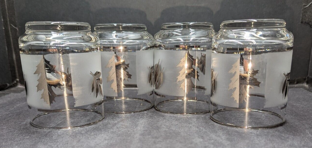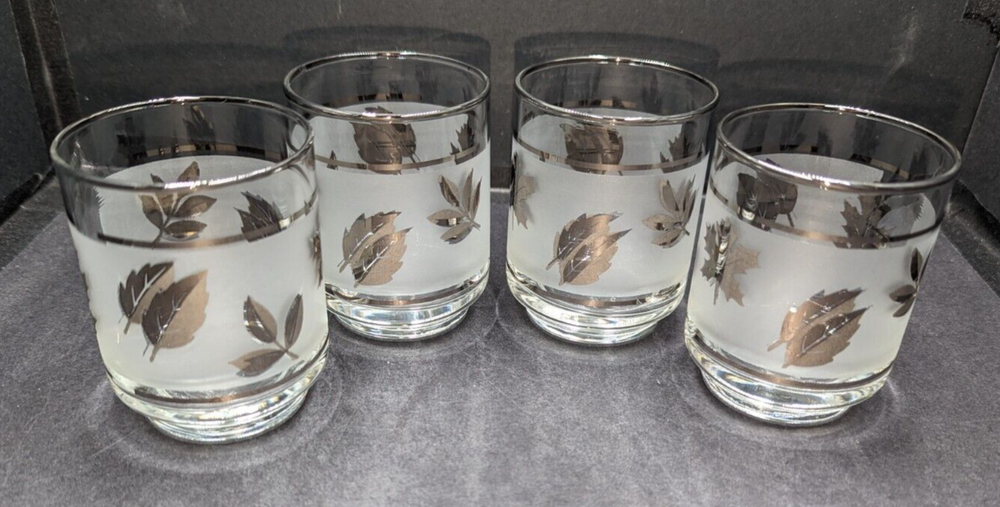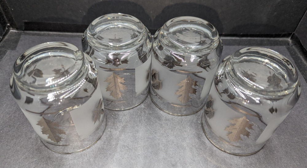 UPC: Does Not Apply Number of Items in Set: Four-Piece Country/Region of Manufacture: United States Type: Tumbler Glass gtin13: Does Not Apply Shape: Round Item Height: 3 in Vintage: Yes Item Diameter: 2 3/8 in Time Period Manufactured: 1960-1969 Features: Decorative Seller Notes: “These tumblers are in lovely pre-owned condition with no damage. Please see the photos.” Capacity: 5 oz. Handmade: No Care Instructions: Hand Wash Only Pattern: Silver Leaf Theme: Leaf Department: Unisex Adults Style: Mid-Century Modern Material: Glass Original/Licensed Reproduction: Original Occasion: All Occasions Backstamp: Impressed Brand: Libbey Color: Clear Frosted & Silver Signed: No