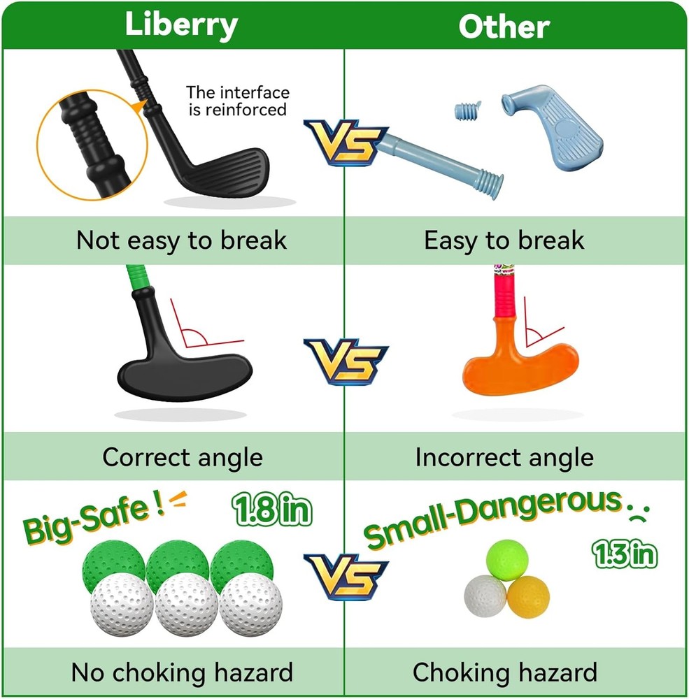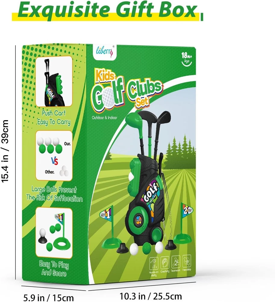 Free eBay listing template designed by dewiso.com Liberry Toddler Golf Set for Ages 2 3 4 Boys Girls, Upgraded Kids Golf Cart with Shoulder Strap Design, Outdoor Indoor Sports Toys Birthday Gifts, Black FREE AND FAST SHIPPING! SAFE & STURDY: Our toddler golf set is made of kid-friendly, high-quality plastic with enhanced hardness for long-lasting play, smooth edges reduce the danger of accidental injury. 1.8-inch diameter golf balls effectively avoid potential choking risks PORTABLE & UNIQUE DESIGN: The retractable handle and flexible wheels allow kids to move kids golf set easily, added shoulder strap offers a second carrying option. Unique ball embedded and hidden hole design make all-in-one golf cart stylish and easy to store REALISTIC GOLF CLUBS: Our toddler golf set contains 3 kids golf clubs: wood, iron and putter (Iron and putter are also left handed compatible). Lightweight, appropriate length clubs are easy to grip and mimic angle of real clubs giving more realistic experience OUTDOOR INDOOR GOLF: Children can use our kids golf set outside like backyard, lawn, park or indoor like living room freely. Playing our removable mini golf toy, kids can not only practice hand-eye coordination, but learn basic rules of golf LITTLE GOLFERS' GIFT: Liberry toy golf set includes 1 golf cart, 3 toddler golf clubs (putter, wood, iron), 6 golf balls (3 green, 3 white), 2 golf tees, 2 holes. The fully equipped kids golf set is an ideal birthday holiday gift for your little golfer. Recommended Height: Under 3'5" (105 cm) Product We offer a 30-Day Return Policy on items which you are not completely satisfied with. You have the option for a full-refund or an exchange of the item. No returns are available on items shipped outside of the US . Shipping We offer Free Shipping to the US and ship within 2 business days of payment, usually sooner. We use UPS express shipping. That's why your products are usually delivered within 3 days . Contact We try our very best to make sure every customer is completely satisfied. If there's a problem , message us! We're happy to help. 24/7 live chat available.