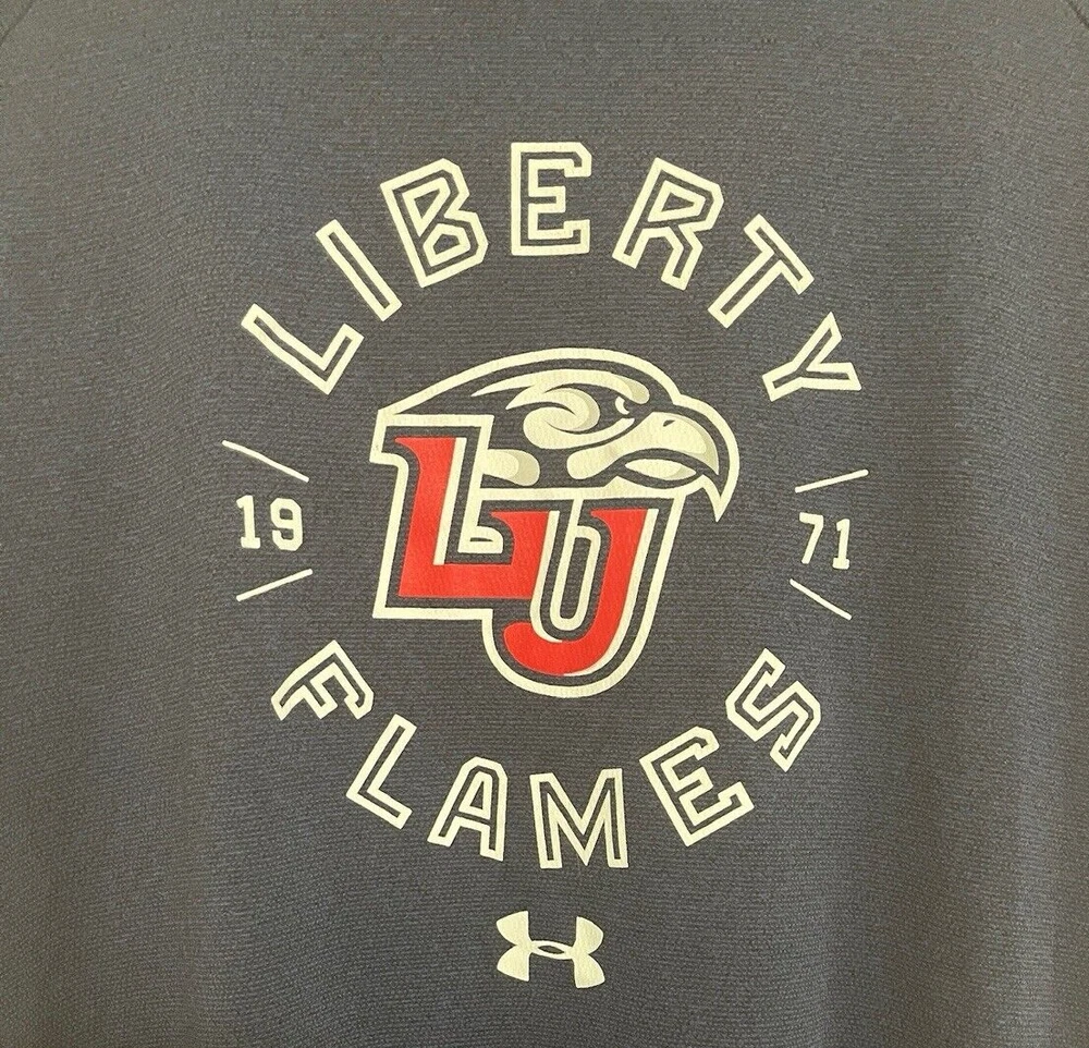 Liberty University Flames Under Armour Short Sleeve T-Shirt Men's XL Navy Blue . Great T-Shirt now for mid-season in the hard to find navy blue. We encourage all buyers to carefully measure themselves and compare to the provided measurements before ordering this or any other apparel to assure proper fit. The T-Shirt is a men's size XL and approximately measures: 25" from armpit to armpit both front and back 25" from the front collar seam to the bottom of the front of the t-shirt 31" from the back collar seam to the bottom of the back of the t-shirt The T-Shirt is pre-owned but in very good condition. The item will be packaged with care and sent out quickly from our smoke free environment. Thank you for shopping with us. SHIPPING INFO: Monday through Thursday orders are typically shipped within 24 hours of purchase. Orders placed on Friday, Saturday and Sunday will be shipped on Monday (excluding federal holidays).