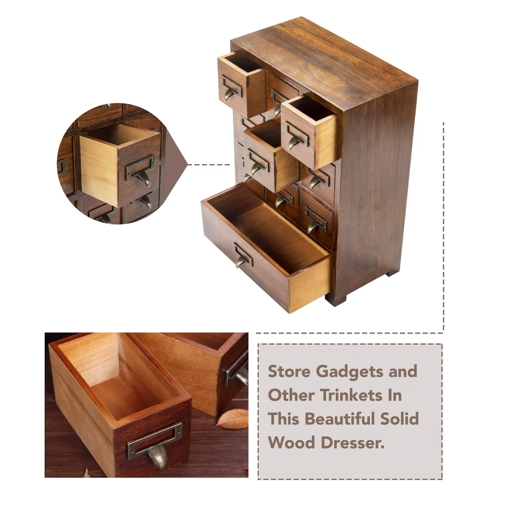 FULLY ASSEMBLED - DRAWER SIZE - 27.5 cm width x 38 cm height x 14.5 cm thick (10.8" x 15" x 5.7") SMALL CABINET SIZE - 13 cm x 7.5 cm x 7.5 cm LARGE CABINET SIZE - 13 cm x 25 cm x 7.5 cm INSTALLATION FREE - MULTI-PURPOSE – Great for organizing various items like medicine, jewelry, crafts, makeup, oils, office items, tea bags, tea, coffee gear 10 SPACIOUS DRAWERS – The top 9 drawers are small, but you can keep various items in it. The larger one at the bottom is bigger and is great for additional storage. GORGEOUS DESIGN – Multi-layered. Made of natural wood. Beautiful, elegant, and classy. Not heavy on desktop, counters or dressers GREAT FOR HOME OR OFFICE – When you need to keep things clean, organized, and tidy in your home or office, this drawer will do the trick.