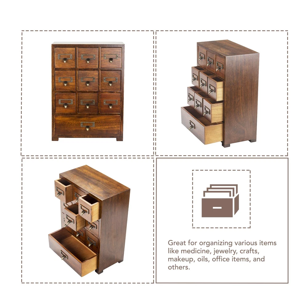 FULLY ASSEMBLED - DRAWER SIZE - 27.5 cm width x 38 cm height x 14.5 cm thick (10.8" x 15" x 5.7") SMALL CABINET SIZE - 13 cm x 7.5 cm x 7.5 cm LARGE CABINET SIZE - 13 cm x 25 cm x 7.5 cm INSTALLATION FREE - MULTI-PURPOSE – Great for organizing various items like medicine, jewelry, crafts, makeup, oils, office items, tea bags, tea, coffee gear 10 SPACIOUS DRAWERS – The top 9 drawers are small, but you can keep various items in it. The larger one at the bottom is bigger and is great for additional storage. GORGEOUS DESIGN – Multi-layered. Made of natural wood. Beautiful, elegant, and classy. Not heavy on desktop, counters or dressers GREAT FOR HOME OR OFFICE – When you need to keep things clean, organized, and tidy in your home or office, this drawer will do the trick.