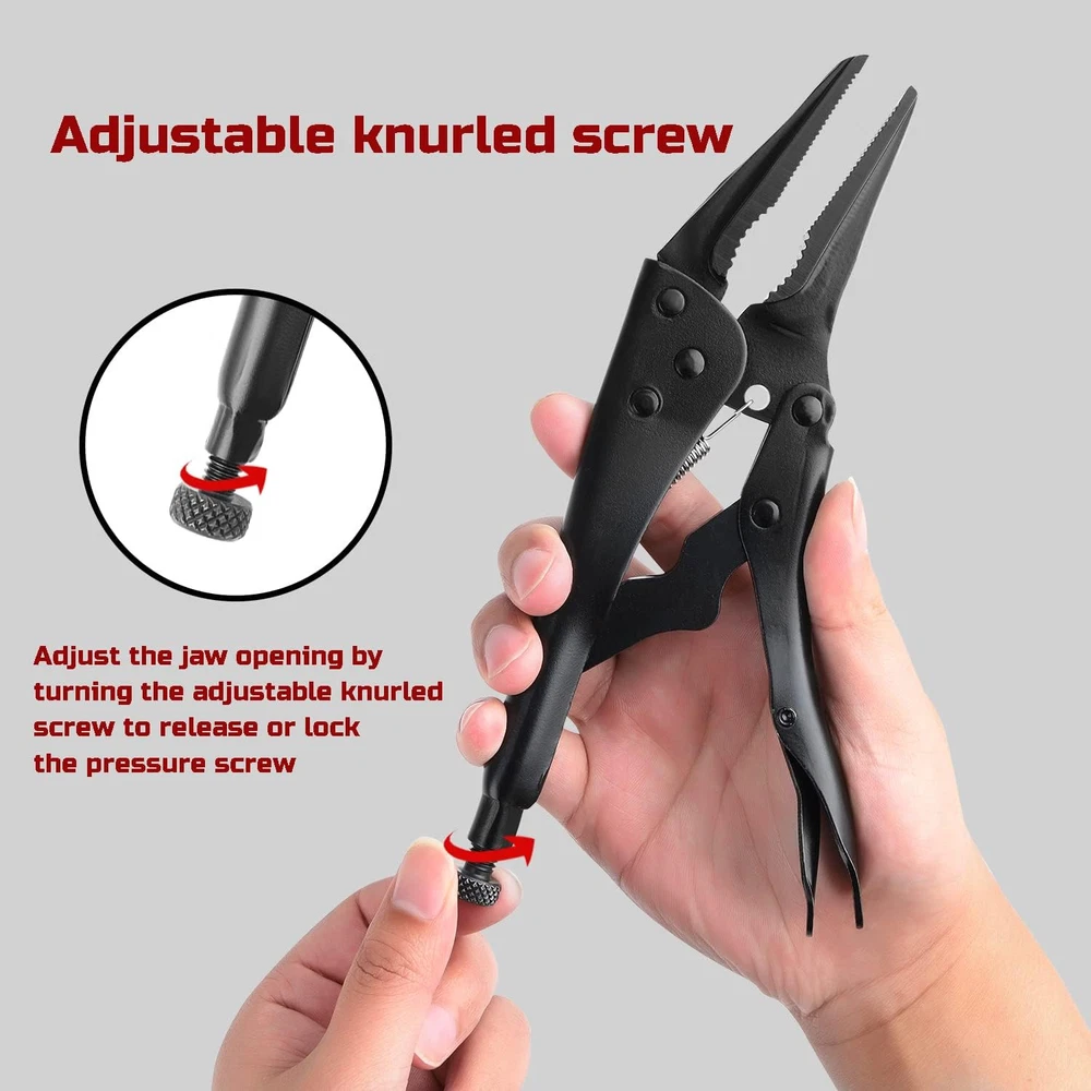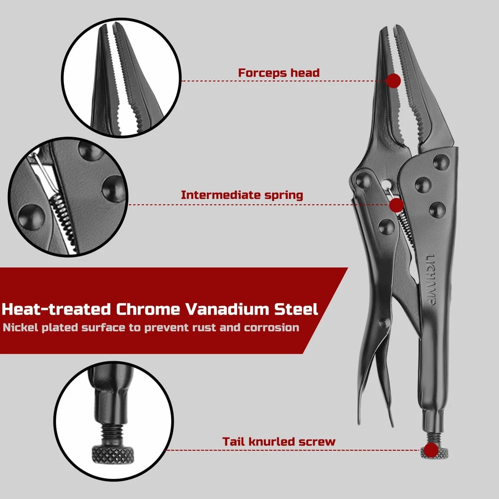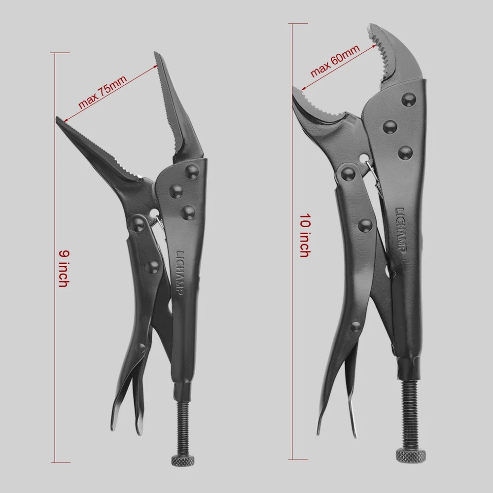 Lichamp 2-Pack Locking Pliers Set, 10 inch Curved Jaw Grip Medium, Silver Product Details Brand: Lichamp Material: Alloy Steel Product Dimensions: 8.66"L x 4.33"W Color: Silver Handle Material: Alloy Steel Item Weight: 1.76 Pounds Specific Uses For Product: Cutting Grip Type: Ergonomic Manufacturer: Lichamp Item Weight: 1.76 pounds Country of Origin: China Item model number: LPSA102BK Size: Medium Item Package Quantity: 1 Batteries Required?: No Brand: Lichamp Material: Alloy Steel Product Dimensions: 8.66"L x 4.33"W Color: Silver Handle Material: Alloy Steel Item Weight: 1.76 Pounds Specific Uses For Product: Cutting Grip Type: Ergonomic LOCK PLIERS SET: Includes 10 inches curved jaw locking plier and 9 inches long nose locking pliers, these curved or straight jaw also features integral wire cutter CURVED JAW PLIERS: Curved locking piler have rounded jaws and are used to securely grip and hold rounded objects like pipes, as well as nuts, bolts and any other hexagonal objects LOCKING PLIERS NEEDLE: Long nose pliers were needled nose pliers with straight and longer jaws, can reach into even narrower gaps to clamp objects, and are ideal for delicate work such as model making STRONG MOLE WRENCH: Built from high-grade, heat-treated Chrome Vanadium Steel, featuring great toughness and won't deform. Nickel-plated finish resists rust and corrosion VISE TYPE GRIP: Classic trigger release with hardened teeth design provides maximum locking force and will grip a variety of shapes from any angle. Includes handy hex key for convenient knurl hole adjustment