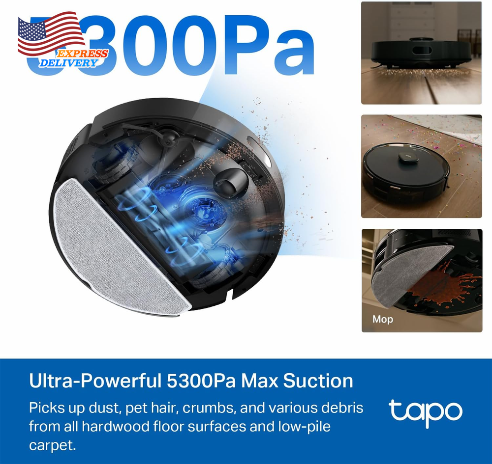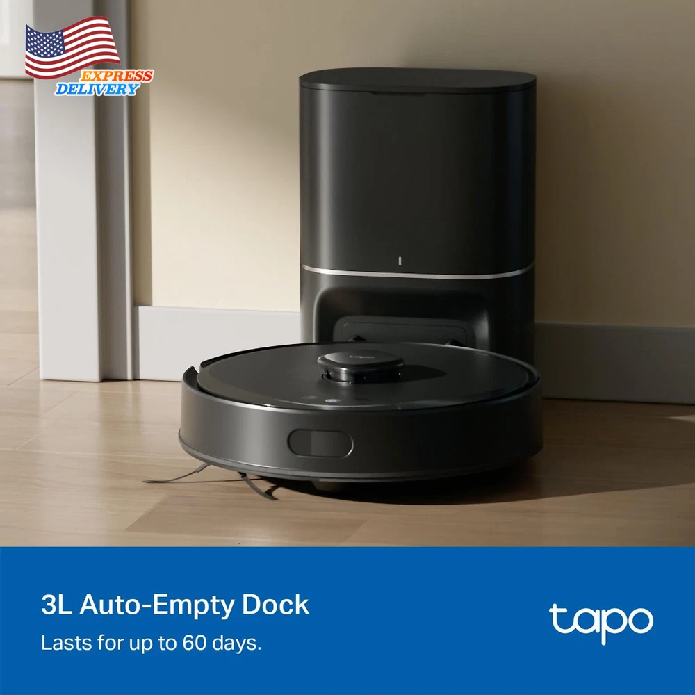 Store New Arrivals Add to Favorite View Feedback Contact Lidar Smart Navigation Robot Vacuum and Mop with Self-Emptying Dock FREE SHIP US Description Style Vacuum w/ Self Empty Dock Are Batteries Included Yes Power Source Battery Powered Control Method App Warranty Description 1 year manufacturer. Battery Life 150 minutes Batteries required Yes Model Name Robot Vacuum Form Factor round Surface Recommendation Hard Floors Controller Type App Control Included Components Robot Vacuum x 1 Item Weight 19.32 pounds Battery Cell Composition Lithium Ion Item Weight 8.78 Kilograms Filter Type HEPA Filter Specific instructions for use Home Automation Special Feature 2-IN-1 Vacuum and Mop with Self Empty Dock, Auto-Docking, Scheduling, Washable Filter, Wet/Dry Color Black Batteries 1 Lithium Ion batteries required. (included) Voltage 110.220 Product Dimensions 13"L x 13"W x 3.9"H ๐๐ณ๐ณ๐ถ๐ฐ๐ถ๐ฒ๐ป๐๐น๐ ๐๐น๐ฒ๐ฎ๐ป๐ ๐ฌ๐ผ๐๐ฟ ๐๐ผ๐บ๐ฒ: Effectively removes dust, pet hair, crumbs, and debris from all hardwood flooring surfaces and low-pile carpet. Activate Ultra mode for up to 5300Pa ultra-powerful suction when extra cleaning power is needed. ๐ก๐ผ ๐ฆ๐ฝ๐ผ๐๐ ๐ ๐ถ๐๐๐ฒ๐ฑ: Utilizes Mesh Grid Technology, a unique grid-like cleaning pattern for thorough coverage, ensuring effective cleaning and preventing missed spots. ๐๐ฎ๐ฟ๐ฝ๐ฒ๐ ๐๐ฟ๐ฒ๐ฎ ๐๐๐ป๐ฐ๐๐ถ๐ผ๐ป๐: Robot increases suction on low-pile carpet to catch hidden dirt and grime and avoids carpeted areas when in mopping mode. Easily add your carpets and rugs on the Tapo app, then set your desired cleaning settings. ๐ข๐๐ฒ๐ฟ ๐ต๐ณ%โ ๐๐๐๐ ๐ฃ๐ถ๐ฐ๐ธ๐๐ฝ ๐ฅ๐ฎ๐๐ฒ: Our DeepVac technology is engineered with an optimized air inlet, an improved cleaning brush, and perfectly positioned air ducts, for superior dust removal and smooth, clog-free airflow. ๐ฆ๐บ๐ฎ๐ฟ๐ ๐๐๐๐ผ ๐๐บ๐ฝ๐๐ ๐๐ผ๐ฐ๐ธ: RV30 Max Plus empties its dustbin automatically after each cleaning, storing debris in a large, disposable 3L sealed dust bag typically lasting for up to 60 days. ๐๐ถ๐๐๐ฅ+๐๐ ๐จ ๐๐๐ฎ๐น ๐ก๐ฎ๐๐ถ๐ด๐ฎ๐๐ถ๐ผ๐ป ๐ฆ๐๐๐๐ฒ๐บ: Advanced LiDAR technology delivers precise 360ยฐ mapping for comprehensive home cleaning. The IMU sensor further enhances navigation by tracking the robot's position for efficient navigation and more accurate cleaning. ๐๐ณ๐ณ๐ผ๐ฟ๐๐น๐ฒ๐๐ ๐๐น๐ฒ๐ฎ๐ป๐ถ๐ป๐ด ๐๐ถ๐๐ต ๐ง๐ฎ๐ฝ๐ผ ๐๐ค+ ๐ฆ๐บ๐ฎ๐ฟ๐: The Tapo IQ+ Smart Cleaning system serves as the robot's brain. Powered by multiple sensors and advanced algorithm, you can reliably leave your home in its hands! ๐ง๐๐ฟ๐ฟ๐ฒ๐ ๐ฆ๐ฒ๐ป๐๐ผ๐ฟ: Equipped with a Turret Sensor that allows for faster and more precise mapping. The sensor also automatically detects areas with insufficient height and backs up to prevent the robot from getting stuck. ๐๐น๐ถ๐บ๐ฏ๐ถ๐ป๐ด ๐๐ฎ๐ฝ๐ฎ๐ฏ๐ถ๐น๐ถ๐๐ ๐จ๐ฝ ๐๐ผ ๐ฌ.๐ด๐ณโโ: The robot can effortlessly climb thresholds up to 0.87โโ, ensuring comprehensive cleaning without missing any rooms. ๐๐ผ๐บ๐ฝ๐ฟ๐ฒ๐ต๐ฒ๐ป๐๐ถ๐๐ฒ ๐ฎ๐ ๐๐ผ๐๐๐ฒ ๐ ๐ฎ๐ฝ๐ฝ๐ถ๐ป๐ด: View a 2D schematic of your homeโs rooms and furniture on the Tapo app. Intelligent algorithms allow for easy customization of room layouts and robot functions with a simple tap. The RV30 Max Plus is a 2-in-1 vacuum & mop combo. It includes Anti-Drop protection, which allows the robot to detect step edges and respond in milliseconds to prevent falls. It also includes a climbing angle of 20ยฐ. There are 5 different suction levels included. The filter is an H11 HEPA. The battery capacity is 2600 mAh. The vacuuming area is 180 m2 and the mopping area is 200 m2. The robot vacuum cleaner also includes Smart Recharge & Resume, where the robot automatically goes to charging dock for recharge and then resumes cleaning from where it left off. You can also set up Virtual Walls and No-Go Zones on app. Place non-furniture items, such as decorative plants or pet beds, that the robot may push. Other features include real-time tracking, 3+1 multi-floor mapping, scheduled cleaning, and breakpoint resumption. The robot provides 3 water flow options for mopping to suit different floor types. The vacuum's included dock has auto dust collection with a suction power of 1700Pa and an included disposable 3L large, sealed dust bag. The robot dimensions are 13 x 13 x 3.9 in. Included in the package is a robot vacuum cleaner, an auto empty dock, a mop cloth mount, a quick installation guide, a washable mop cloth, a 3L disposable dust bag, a main brush, 2 side brushes, a HEPA filter, and a cleaning brush. The wireless connection is IEEE 802.11 b/g/n, 2.4 GHz band only and Bluetooth 4.2 (onboarding only). The robotโs input is 20V / 0.6A. The dock max power is 45 W and the robot rated power is 45 W. The robot vacuumโs filter is washable and reusable. See Quick Installation Guide for instructions on how to clean the filter. This product is great for dog or pet owners who clean up their petโs food, pet hair, and pet treat crumbs. Also great for health advocates, parents, busy professionals, or smart-home enthusiasts. ABOUT US We offer the best prices around on high quality products. Our E-store includes media such as books, movies, music and games while offering electronics, toys, sporting apparel, clothing, tools, general home, garden items and more. SHIPPING We are always working hard to ensure