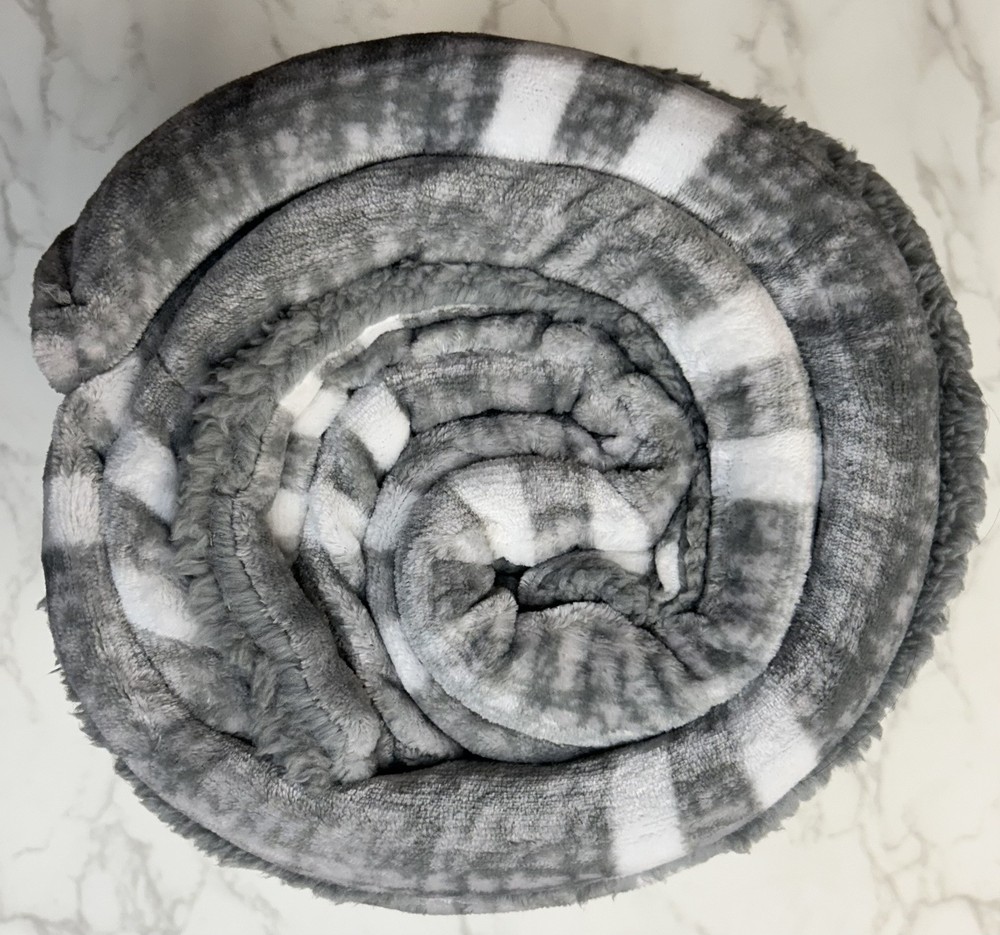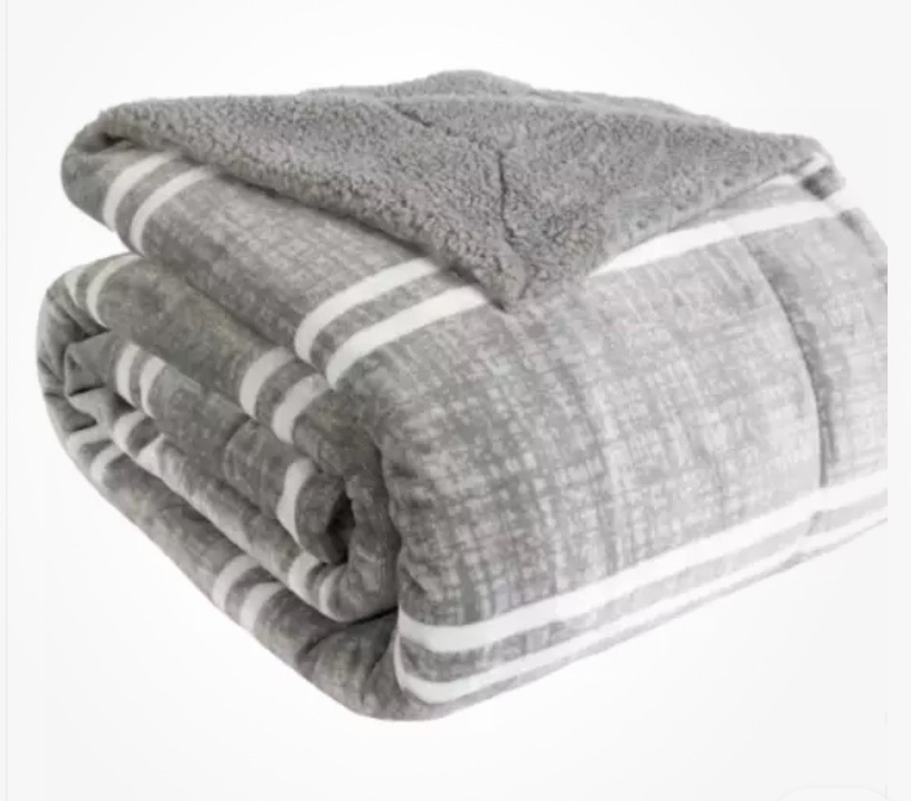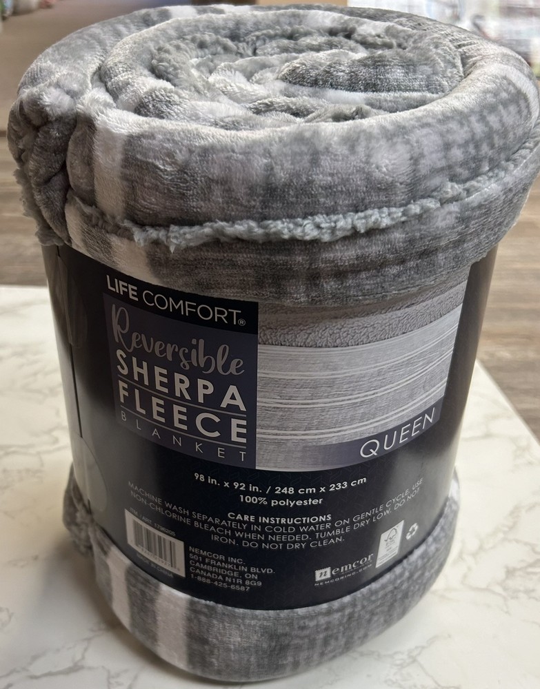 The Life Comfort Reversible Sherpa Fleece Blanket is a modern-style blanket made of soft and warm Sherpa fleece material. It is a solid-colored gray blanket with a rectangular shape and queen size, measuring 98 inches in length and 92 inches in width. The blanket is reversible and features a different design on each side. It is suitable for teens and adults and can be used in the bedroom during the winter season. The blanket is easy to care for and can be machine washed, but not dry cleaned.