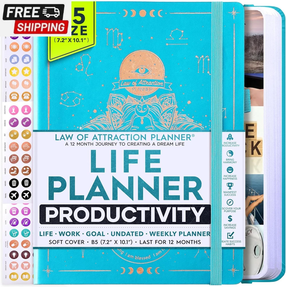 Life Planner - Undated Deluxe Weekly and Monthly Planner, a 12 Month Journey to Increase Productivity, Happiness & Enhance Organization | Life Organizer, Gratitude Journal, Agenda Planner, to Do List, Gift Box & Stickers - Start Anytime UNDATED PLANNER - All the success tools you need to create the life you always wanted. Sunday start pages, B5 Size (7.2 x 10.1 inches), thick paper 100 gsm, 248 pages of life transformation, 52 weekly, 12 monthly planning overviews & reflection, 30 dotted journal pages, up to 295 productivity stickers, habit trackers, mind maps, out foldable vision board, morning, evening routines. This life planner is UNDATED daily planner, undated weekly planner and undated monthly planner giving you the freedom to start your journey whenever suits you best. INCREASE PRODUCTIVITY AND HAPPINESS - This is a deluxe life goal planner showing you how to become the best possible version of yourself on a mental, physical & interpersonal level using the law of attraction vibration guide. This planner is a daily planner, monthly planner, weekly planner, productivity planner, goal planner, business planner, to do list planner, planner notebook & gratitude journal all-in-one. ACHIEVE YOUR GOALS USING THE LAW OF ATTRACTION - Learn how to set big goals, be happy and manage your time well, and follow the same methods millionaires around the world use to set goals and achieve them. This monthly planner undated planner, life planner, hourly planner, yearly planner, work planner, schedule planner or appointment book. It's a perfect planner for women and men. REDUCE OVERWHELM, STRESS AND FIX PROCRASTINATION - Follow a unique 8 step system that will help you bring back harmony, clarity, and peace in your life while achieving your goals. This planner is perfect for birthday gift, mother's day, anniversary gifts, and christmas gifts. LUXURIOUS & TOP QUALITY- Ideal for both women and men, perfect for entrepreneurs, professionals, college students, and everyone who has a burning desire to turn dreams into reality. No questions asked money-back guarantee. Product Description UNDATED DAILY PLANNER READY TO CREATE THE LIFE YOU ALWAYS WANTED WITH THE BEST LIFE PLANNER ON THE MARKET? The ONLY Law of Attraction Planner 2025 comes with Udated Daily Planner options that helps you find your Purpose, Eliminate Procrastination, Anxiety, Overwhelm and Stress by Guiding you Through 8 Simple Steps To Maximize your Productivity, Increase Creativity and Passion for Crushing Your Goals! The Law of Attraction Planner is a Life planner - A Manifestation Journal aids you in manifesting your desires through the practice of keeping a Manifesting Journal - a Time Management Planner - a Self Care Journal - a Vision Board Journal - a Life Coach - Work Planner, Agenda and Personalised Organiser , All in one. It combines the manifesting abilities and spiritual guidance from the law of attraction that also includes all the tools to achieve your short and long-term goals like principles of wealth building, and self-motivation all integrated into a daily schedule planner. Experience the transformative power of a 3-minute Positivity Journal and Planner, designed to create a manifesto effect from day 1! The Law of Attraction Planner contains 248 life-changing pages with 45 journal pages, habit trackers, mind maps, out foldable vision board, morning & evening routines. It also has a pen loop and 2 bookmarks. THE LAW OF ATTRACTION PLANNER WILL BE YOUR SECRET "UNFAIR ADVANTAGE" 2025 Hourly Planner , THERE’S A SMARTER WAY TO PLAN YOUR BEST YEAR! A LIFE THAT’S WORTH IT, IS WORTH PLANNING Once you start using the law of attraction's unique 8-step process you will understand how high achievers can accomplish so much more success in the same amount of time everyone else has. The 8-Step Law of Attraction Roadmap guides you to improve in all areas of your life from your career, family, health, fun activities, habits, emotional, relationships, spiritual, and life goals. As you continue using the law of attraction planner you will forget Incomplete, LOW-QUALITY Planners That ARE MISSING IMPORTANT STEPS AND Will Never Lead you To True Success! The Law of attraction Planner includes special tools to help you achieve your short and long term goals and to help you find your passion and purpose in life. This is the only Planner with the key self-development processes found inexpensive personal development books and life coaching courses that have been divided into 8 steps for radical life transformation. Let’s take a look at the 8-steps inside the Freedom Mastery’s Deluxe Law of Attraction Planner that similarly priced but lower quality planners lack. The 8-Step Law of Attraction Roadmap guides you to improve in all areas of your life from your career, family, health, fun activities, habits, emotional, relationships, spiritual and life goals. Life planner - a Manifesting Journal - a Time Management Planner - a Self Care Journal - a Vision Board Journal - a Life Coach - all in one YOUR IDEAS AND PLANS DESERVE TOP QUALITY PLANNERS THAT LAST A LIFE TIME The Law of Attraction Blueprint life planner was designed to give you a new self-awareness personal planner and self-discovery daily schedule planner of your life as it guides you to attract what you desire. The Law of Attraction Planner is the first Planner to use a Reward Structure.(Step 1&2). Science has confirmed that using a Reward on completing a goal creates positive neural pathways to better habits. The daily planner 2025 guides you to find your purpose and passion and see on an organized notebook the vision of your future life . Writing your mission statement on an appointment book helps you clearly know what is most important to you with the help of a productivity planner so you are on the right path to using the power of the law of attraction in creating a happier life. BEST Goal Planner 2025 Vision Board The Law of Attraction daily planner follows the same methods used by bi