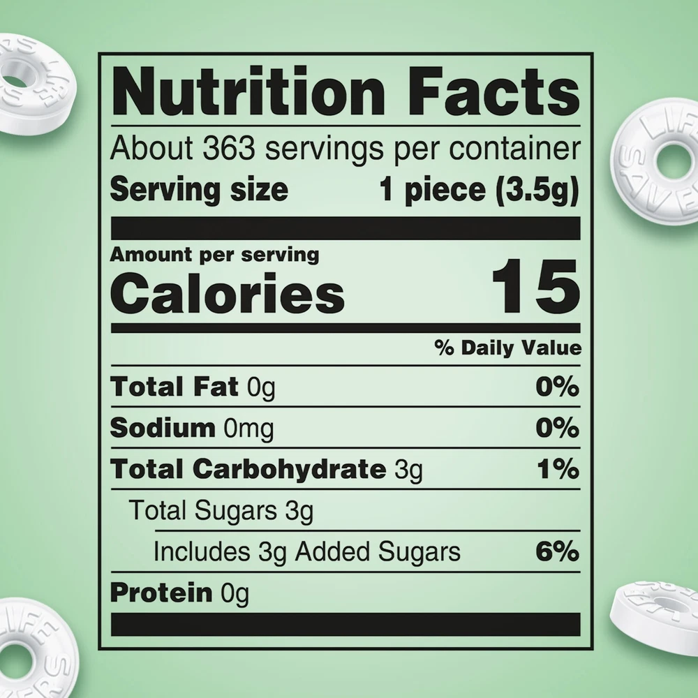 Life Savers Wint-O-Green Breath Mint Hard Candy, Party Size - 44.93 oz Product details Stock up on bulk breath mint hard candy with a bag of LIFE SAVERS Wint-O-Green Breath Mints. Grab Wintergreen LIFE SAVERS to share, pack in your purse, or keep in your pocket for fresh breath anytime. Each LIFE SAVERS hard candy comes individually wrapped, making them a great bulk candy to toss in a bag, or fill a candy bowl. There are endless ways to enjoy LIFE SAVERS Wint-O-Green Breath Mints! Contains one (1) 44.93-ounce bag of LIFE SAVERS Wint O Green Breath Mint Hard Candy Filled with icy wintergreen flavor, LIFE SAVERS Mints are a Hole lot of fun Every office needs a stash of minty goodness to combat coffee breath and boost confidence for big presentations Make date night fun and fresh! LIFE SAVERS Breath Mints keep you ready whether it’s your first date or your 50th anniversary Stock up your pantry or use LIFE SAVERS bulk mint hard candy for holidays, event party favors, office treats, study breaks, parties and more! Nutrition information Nutrition facts Refer to the product label for full dietary information, which may be available as an alternative product image. 363 Servings Per Container Serving Size 1 Amount per serving Calories 15 Amount per serving % Daily Value* Total Fat 0g Sodium 0mg Total Carbohydrate 3g Protein 0g * The % Daily Value (DV) tells you how much a nutrient in a serving of food contributes to a daily diet. Calories per gram:Fat 9 • Carbohydrate 4 • Protein 4 Specifications Features Hard-candy mints with a hole in the middle, Great to keep around the office; in the breakroom, at the reception desk, or to share with coworkers, Mint hard candies with a refreshing taste Food Allergen Statements Fat-free Brand Life Savers Assembled Product Dimensions (L x W x H) 12.60 x 7.30 x 3.40 Inches More details Warranty information Please be aware that the warranty terms on items offered for sale by third party Marketplace sellers may differ from those displayed in this section (if any). To confirm warranty terms on an item offered for sale by a third party Marketplace seller, please use the 'Contact seller' feature on the third party Marketplace seller's information page and request the item's warranty terms prior to purchase. Ingredients Sugar, Corn Syrup, Artificial Flavor, Stearic Acid.