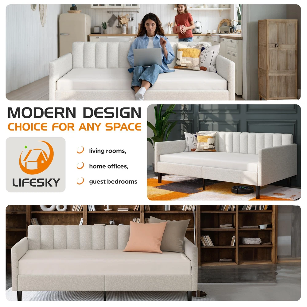 Twin Size Daybed: The LifeSky twin-sized daybed is compact & multi-functional, perfect for small living spaces, offers the flexibility of a bed and a sofa in one. It fits perfectly in living room, apartments, studios, or dorm rooms, providing a stylish and comfortable solution for sleeping and sitting(mattress not included). Upholstered Daybed: This daybed is upholstered in luxurious boucle fabric, featuring classic button tufting that enhances any decor. Its elegant design seamlessly blends into both modern and traditional settings, enhancing the visual appeal of your home or office. Metal Frame & Bentwood Slat System: Crafted with a sturdy metal frame reinforced by additional side rails, this daybed comfortably supports up to 400 lbs. The integrated bentwood slat system provides a reliable, squeak-free foundation, enhancing both mattress support and breathability for a restful sleep without the need for a box spring. Easy Assembly & Hassle-Free Setup: The LifeSky daybed is designed for simplicity, with clear instructions and all necessary tools included. Assembly can be completed swiftly in about 30 minutes by two people, making it easy to transform any room into a versatile living space. Versatility for Modern Living: Ideal for use in living room, bedrooms, family rooms, or guest rooms, this daybed serves as both a comfortable bed and a plush couch. Its adaptable design makes it suitable for daily relaxation or hosting overnight guests, catering to a range of modern living needs.