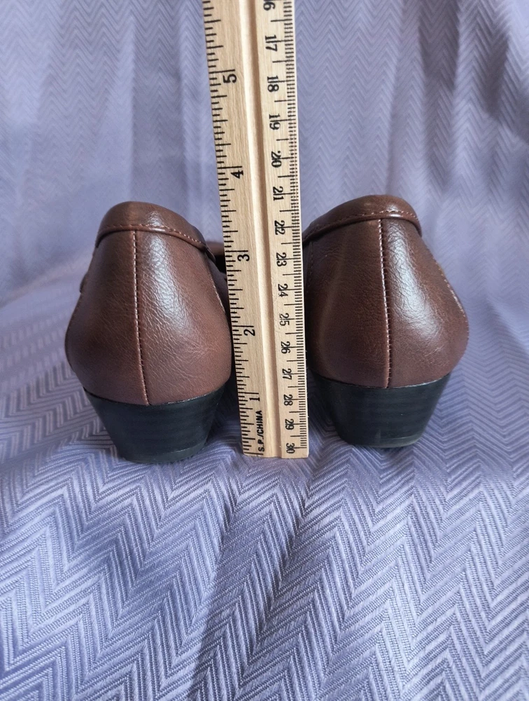 This is a pair of LifeStride women's brown wedge pump heels in size 8M. They feature a cushioned and comfortable design with a faux leather upper material. The shoes have an almond toe shape, slip-on closure, and a mid-height heel of 2-2.9 inches. The brand is LifeStride, known for its Soft System technology for added comfort. Item is used and therefore shows signs of wear see photos for any details, measurements and/or flaws. Highly suggest that you clean the item before the first use to cleanse any spots or stains.