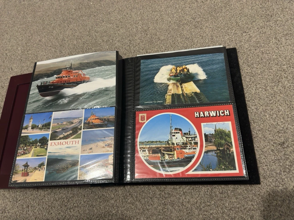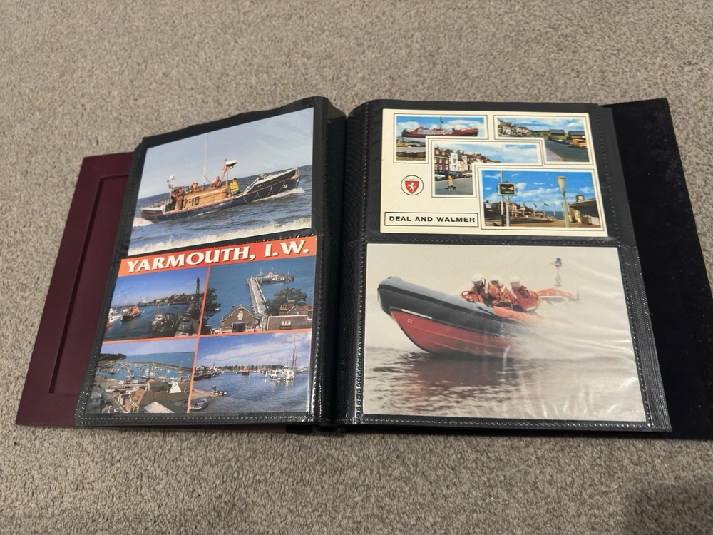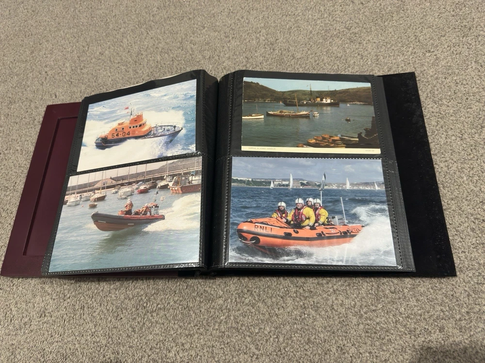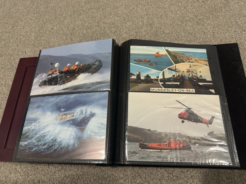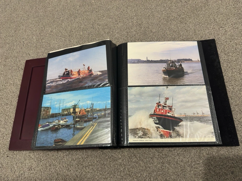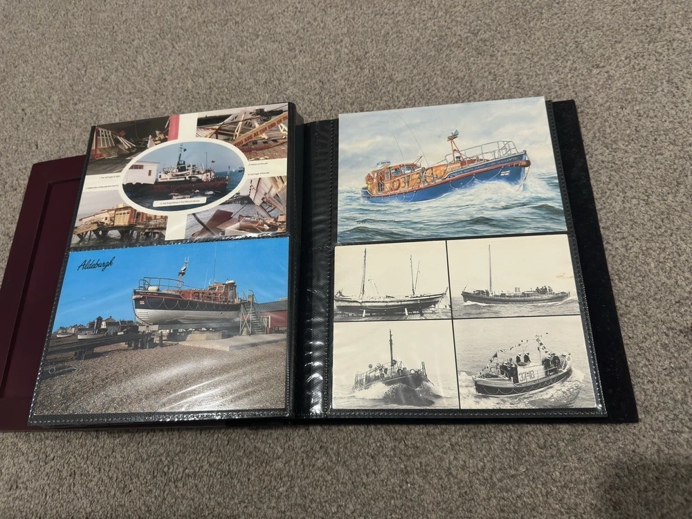 including postcards, photographs and other maritime memorabilia connected with lifeboat and rescue services. The album is not complete and includes 9 empty pages, suggesting the original owner intended to continue building the collection but did not finish it. Items are mounted inside the album and show signs of age and handling, consistent with an older collection. The album itself also shows general age-related wear. A solid mixed lot ideal for lifeboat, maritime or RNLI collectors. Please see photos for full details of condition and contents.