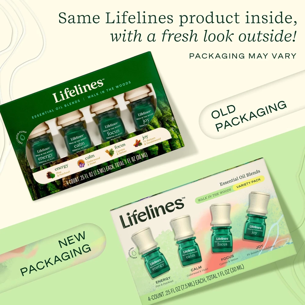 Lifelines Essential Oil Blend Set in Walk in the Woods: All the blends in this collection evoke rich, verdant forests and velvety moss underfoot. 4-pack. Not compatible with our ClickWick Plant, Candle, or Shower diffusers. Invigorating Aroma: Joy features Fir Balsam and Sandalwood. Energy features Pine and Patchouli. Focus features Cypress and Vetiver. Calm features Cedarwood and Violet. Mess-Free Precision Pump: Dispense the perfect amount every time with no guesswork and no mess. NOT compatible with our ClickWick Candle, Plant, or Shower diffusers, which require ClickWick Essential Oil Blends. One-of-a-Kind Gift: The perfect gift for the person who has everything. Great for anyone looking to unwind and relax with delightful scents. Only the Good Stuff: Essential Oil Blends were created for an aroma experience using pure essential oils and botanicals sourced from around the globe. Free from parabens, phthalates, and dyes. Sensory Immersion: The practice of activating your senses. Seeing, smelling, and touching delightful things brings you back to the here and now. Let your senses work their magic. About Lifelines: Lifelines was created to help people enhance their well-being in fast, effortless, and fun ways. Meet the tools designed to help you relax and unwind anytime, anywhere.