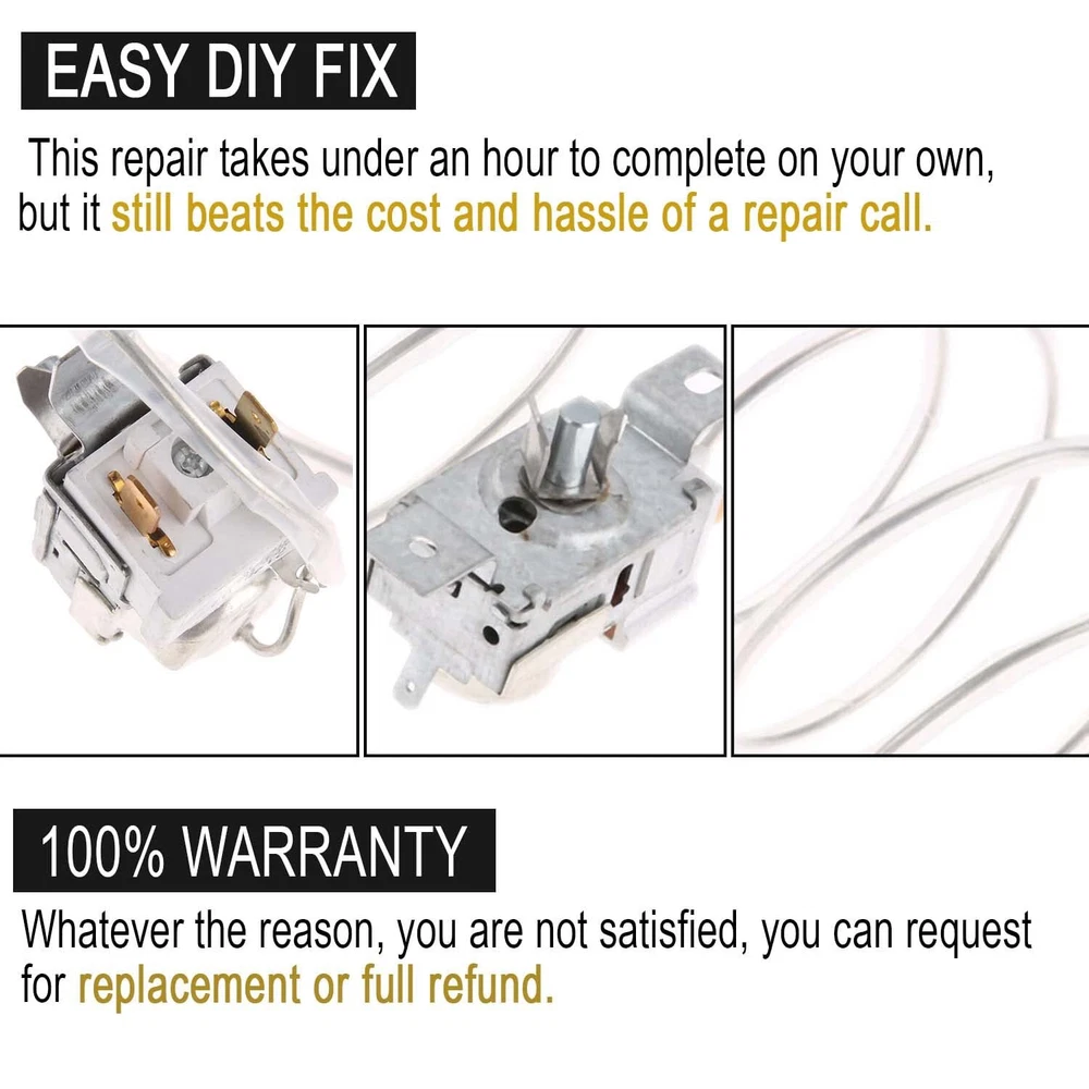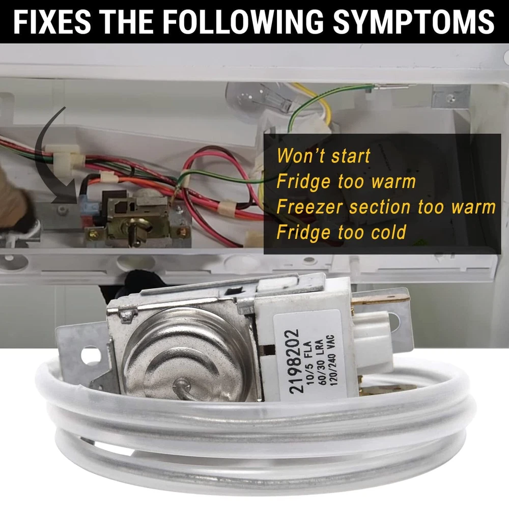 The 2198202 Refrigerator Cold Control is used in refrigerator units and freezers as a sensor. The thermostat senses the temperature increase in the evaporator during the cycle of defrosting and turns off when ice is melted. The tools needed for this repair project is a putty knife, Phillips and flat blade screw driver, 1/4 inch nut driver, and needle nose pliers. Remember to unplug refrigerator from power source as a safety precaution. Replaces part numbers: PS11739232, WP2198202VP, WP2198202, AP6006166, 1110552, 1115242, 1115243, 1115244, 1115245, 1129437, 2161283, 2161284, 2169112, 2169113, 2198201, 99989726, PS329884, AP3037004, etc. Works with most top name brands: Whirlpool, Kenmore, Sears, Roper, Estate, Crosley, Inglis, KitchenAid, Maytag, Amana. Works with the following models: 2VED27TKN00, 3ED22DQXAN00, 3ED22DQXBW03, 3ED22DQXDN03, 3ED22RQXXW00, 3ED25DQXDN00, 3ED27DQXBW00, 3KART700GW01, 3VED23DQEW0... 106.52574200, 106.55122700, 106.58289990, 106.5858782, 106.59512290, 106.5951799, 106.59782290, 106.85500510, 106.8590293, 106.859472, 106.94000080β¦ Fixes the following symptoms: Will Not Start. Fridge too warm Freezer section too warm Fridge too cold Please reach out to us if you have a question about compatibility. Comment below in the customer questions and answer section or send us a message on the Seentech storefront. Weβre happy to help ensure you select the right part number for your Refrigerator MODEL NUMBER: 2198202 Refrigerator Cold Control Thermostat EASY TO INSTALL: Brand new refrigerator temperature control replaces Whirlpool, Kenmore, Roper, Estate, Crosley, Amana, Inglis REPLACES PART NUMBER: 1110552, 1115242, 1115243, 1115244, 1115245, 1129437, 2161283, 2161284, 2169112, 2169113, 2198201, 99989726, WP2198202, WP2198202VP, PS11739232, AP6006166.. Works with the following models: Whirlpool - 2VED27TKN00, 3ED22DQXAN00, 3ED22DQXBW03, 3ED22DQXDN03...Kenmore0,0,0,,0... EASY TO INSTALL: Forget the repairman. Remove and replace the cold control thermostat in under an hour. You just need a Philips screwdriver, quarter-inch nut driver, and a small flathead screwdriver. ππ’π‘πππππ‘π§ π£π¨π₯ππππ¦ππ¦: Enjoy a 30-day return window on your purchase. Your satisfaction is our priority. If you have any questions, please don't hesitate to contact our customer service team.