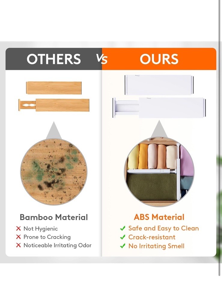 Open box New item! Expandable & Adaptable: With a compact width of 0.8", a height of 4", and an adjustable length ranging from 13.5" to 22", our drawer dividers effortlessly fit into most drawers and cabinets, providing a perfect solution for organizing your items and maintaining tidy drawers consistently. Stable Installation: Simply press the top button to adjust the length before placing it. After placing, secure it tightly by stretching it out again. The strong spring tension ensures that each dresser organizer stays securely upright. To retract, press the button and push in the stretched side. Advanced Design: Our drawer organizer for clothing is made from stable ABS material and has high-quality EVA foam sponges at the ends to prevent scratches and damage to drawer walls, leaving no trace or residue. Additionally, our divider is patented (Patent No: US12133593B2) for a unique experience. Versatile: These drawer organizers can be installed in any drawer of your house or office, and specifically designed to organize clothing, kitchen utensils, office supplies, cosmetics, bathroom essentials, and more. Ensuring your belongings stay neatly organized and easily accessible. Custom-fit Placement: Our versatile drawer dividers offered in sets of 5, 8, and 12, and can be positioned in either a vertical or horizontal orientation, ensuring a perfect fit for your organizing requirements. This flexibility enables you to select the ideal quantity for your needs.