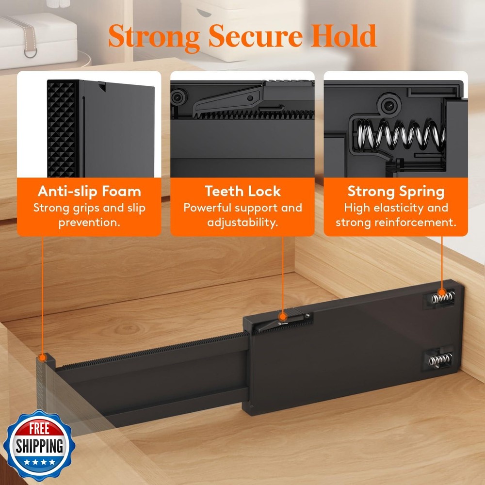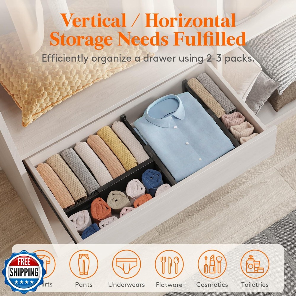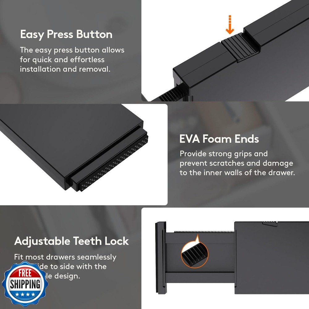 Lifewit 6 Pack Drawer Dividers 4" High, 11-17" Adjustable Drawer Organizers for Clothes, Expandable Dresser Separators in Bedroom/Bathroom/Kitchen/Fridge/Office Organization and Storage, Black Features Expandable & Adjustable: With a width of 0.8", a height of 4", and an adjustable length ranging from 11" to 17.5", our drawer dividers can be easily fitted into most drawers and cabinets, offering the convenient solution to organize your items and maintain tidy drawers at all times. Easy to Install: To adjust the length, press the top button before placing the drawer organizer, and then stretch it out again to secure it tightly. The strong spring tension keeps each organizer upright and secure. When retracting, press the top button and push in the stretched side. Advanced Design: Our dresser organizer is made from stable ABS material and has high-quality EVA foam sponges at the ends to prevent scratches and damage to drawer walls, leaving no trace or residue. Additionally, our divider is patented (Patent No: US12133593B2) for a unique experience. Customizable Placement: Our versatile drawer dividers for clothes are available in sets of 6, 9, and 14, and can be placed either vertically or horizontally to accommodate a variety of organizing needs. This flexibility allows you to select the quantity that best suits your needs. Shipping Free & Fast Shipping: We offer free shipping to most of the USA with a normal delivery time of 3-7 days. However, due to the current situation, additional delivery time (up to 3 weeks) may be required for some items. Alternative Carriers: We may use alternative carriers (e.g., USPS, FedEx, UPS) to ensure your package arrives safely and on time. Due to the use of multiple carriers, we are unable to provide a tracking number automatically. Handling Time: Orders are processed and shipped within 1-2 business days of receiving cleared payment. Shipping Restrictions: Shipping to Alaska, Hawaii, Puerto Rico, Guam, and other US territories may incur shipping charges or delivery restrictions. Please contact us before ordering, or your order can be refunded/cancelled. State Restrictions: Certain items may not be shipped to California due to state regulations. Contact for Tracking Updates: If you require tracking updates or have any concerns about the delivery of your order, please feel free to contact us, and we will be happy to assist you. Return Policy 30-Day Hassle-Free Returns: If you are not completely satisfied with your purchase, you can return the item for free within 30 days of receiving it for a full refund or exchange. Easy Return Process: Contact us, and we will provide you with a prepaid return shipping label and detailed instructions. No Restocking Fee: There are no restocking fees for returns. However, the buyer is responsible for return shipping costs if the return is not due to a seller"s error. Refund Processing: Refunds will be processed within 1 business day of receiving the returned item in its original condition. Feedback Your feedback is extremely important to us. We strive to provide the best products and customer service possible. If you are satisfied with your purchase, please take a moment to leave us a positive review. If you have any concerns or issues with your order, please contact us before leaving negative feedback. We are committed to resolving any problems and ensuring your satisfaction. Contact Us If you have any questions or concerns, please feel free to reach out to our customer support team. You can contact us through the eBay messaging system. We are available Monday to Friday, 9:00 am to 5:00 pm EST, and we will do our best to respond to your inquiry within 24 hours. Thank you for supporting our small family business!