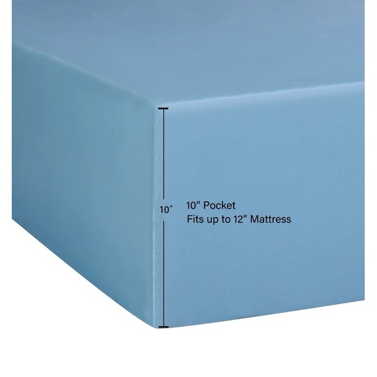 The product is a light blue microfiber polyester fitted sheets/mattress covers from the brand Mainstays. These sheets are designed for kids' rooms in a solid color blue pattern, with a thread count of 201-400 for a comfortable feel. Made of polyester and microfiber, these sheets are easy to care for with machine wash instructions, making them a practical and durable choice for a bedroom setting. Perfect for creating a cozy and family-themed bedroom environment. Bought and never used. Not in original package