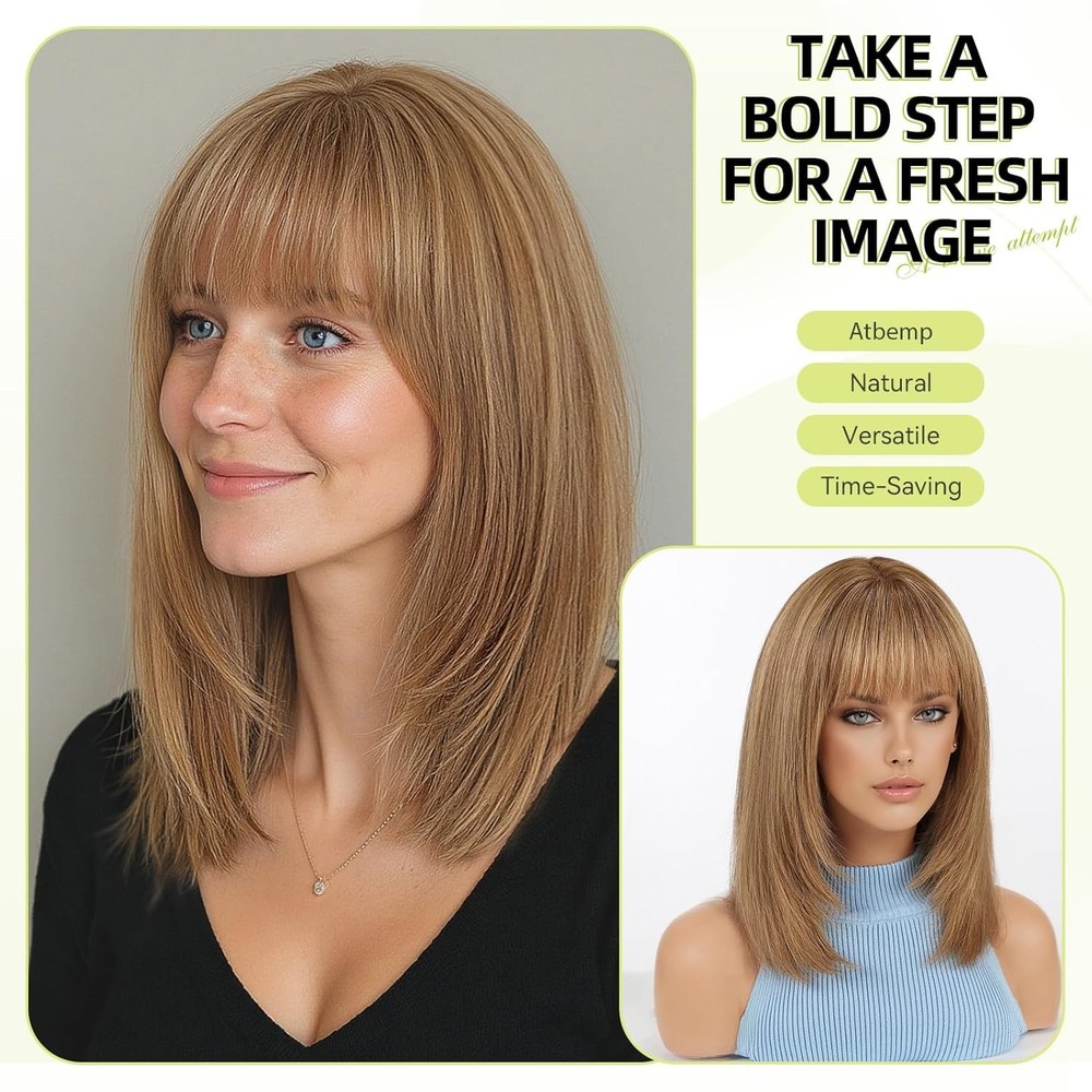 Highlight Brown Straight Bob Wig With Bangs 13x4 Lace Front 100% Human Hair Wig