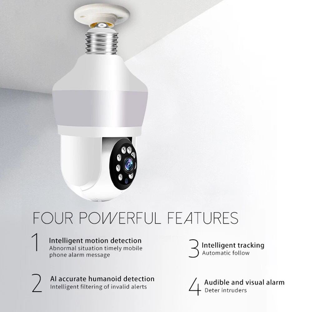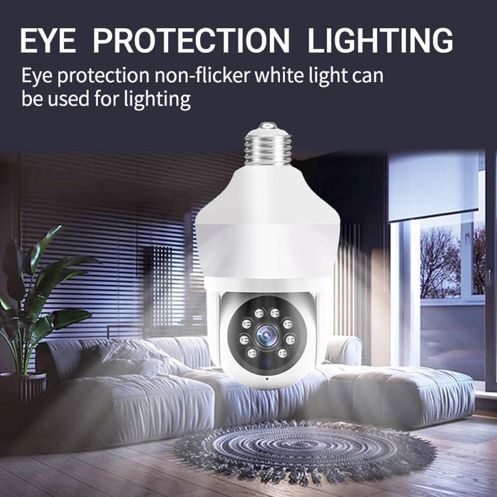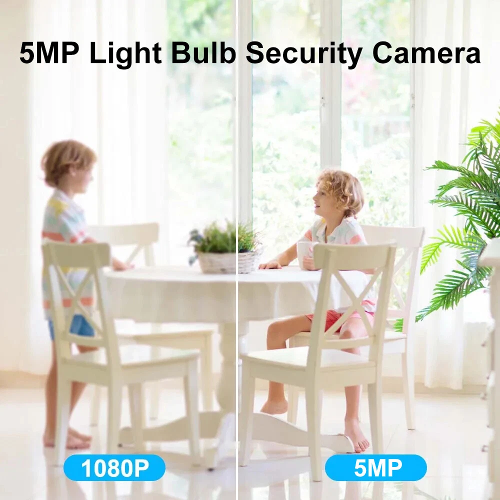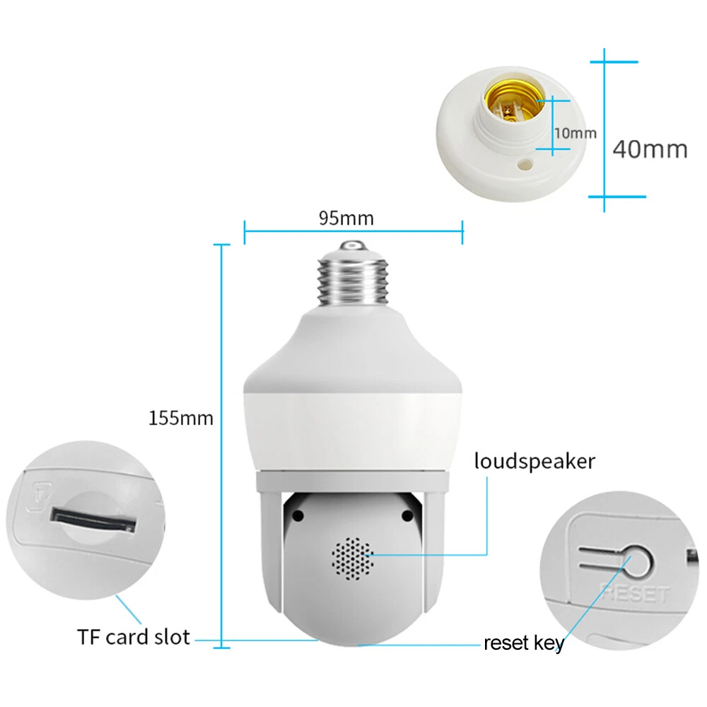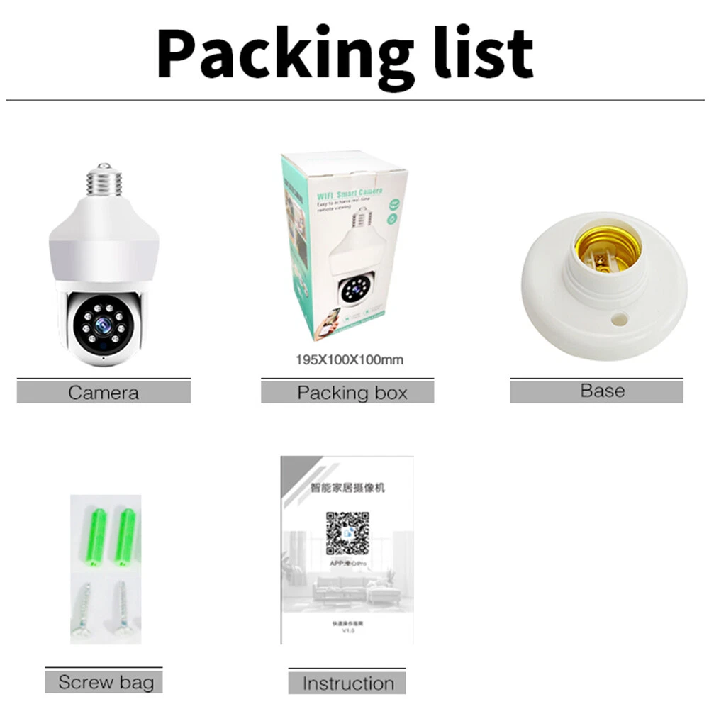 Features: * Remote control: monitor the smart bulb wifi camera anytime and anywhere via APP * LED bulb: the panoramic camera bulb can be turned on or off automatically, manually, and periodically. * HD 5MP: 5 megapixel high quality video clips provide clear and detailed images. * Wifi Connection: light bulb camera supports connection via wifi. (Only support 2.4Ghz router) * Alarm function: when the bulb camera detects someone entering the shooting area in time, it will push an alarm notification to your mobile phone. * Two-way audio: with built-in microphone and speaker, you can talk to others through the camera. * Pan & Tilt: control the rotation to any corner you want to check in APP, protect your home security. * Dual light source night vision: built-in 4 white LEDs and 4 infrared LEDs, you can see clear images even in complete darkness, support full colour night vision. Specification: Product name: WiFi camera Camera type: bulb Lens Pixel: 5MP Video compression: H.265 Camera lens: 3.6mm Waterproof rating: IP66 Sensor: CMOS Recording Mode: All Day and Event Recording Number of light beads: 4 IR + 4 white light. Network support: P2P mode, 2.4Ghz wireless Memory Expansion: 128GB micro SD card (not included) Rotation Angle: 355°(Horizontal)/90°(Vertical) Alarm Trigger: Video push, speaker alarm, alarm recording Applicable places: home, shop, school, supermarket, factory, etc Installation: Embedded Cloud Storage: Subscription required Apps: v380pro Compatible devices: Android/ios Working power supply: 110-240V Base type: E27 Product size: about 155*95mm Product colour: white Product material: ABS Packing list: 1* Light bulb camera (not including TF card) 1* E27 base 1* User manual 1* Screw kit Attention: 1. TF card in the photo is not included! 2. Colour may vary according to the light! 3. Please allow a slight 1-2cm difference due to manual measurement! 4. Thank you for your understanding and attention, wish you have a pleasant shopping experience! On Nov 18, 2024 at 04:35:43 PST, seller added the following information: