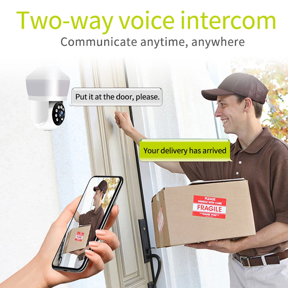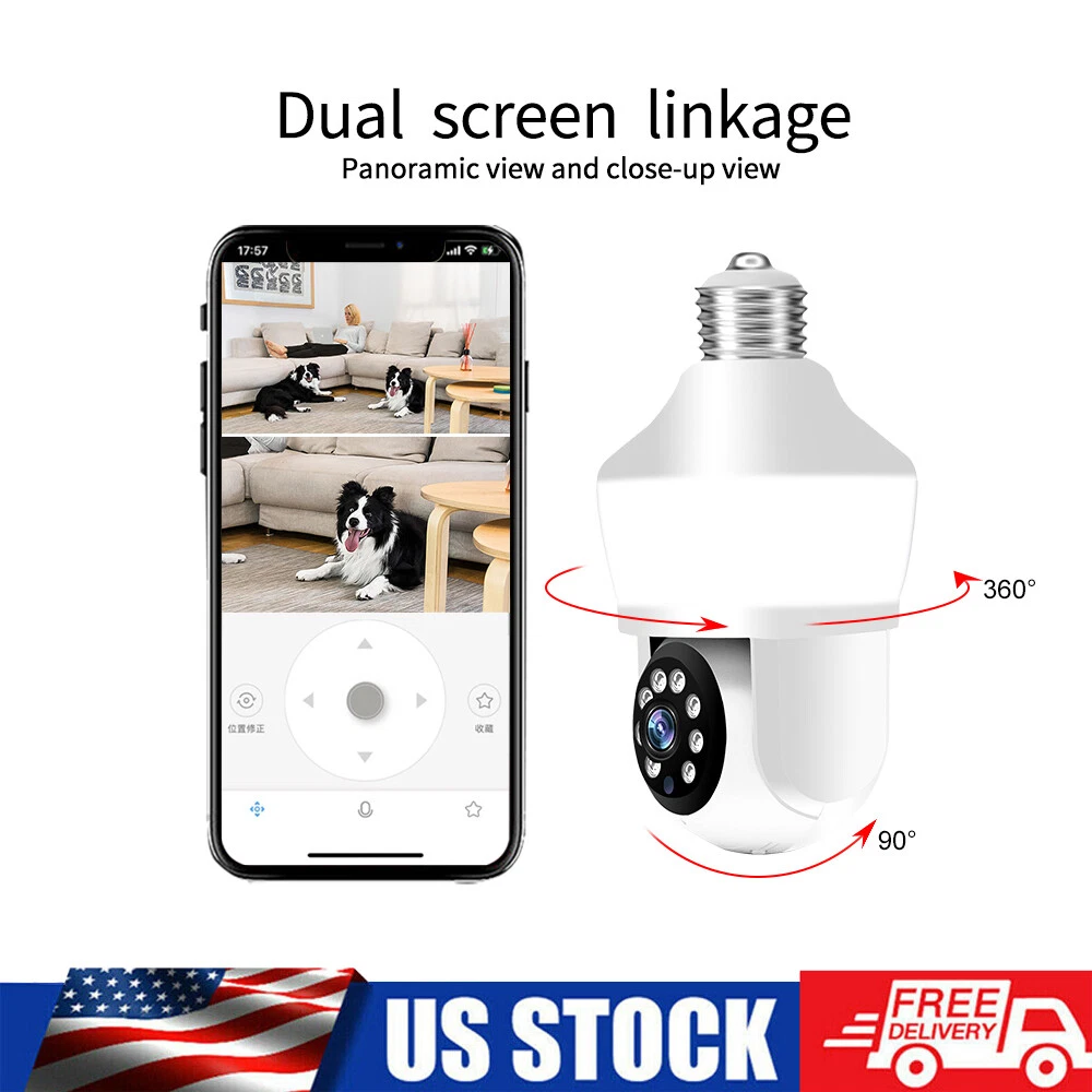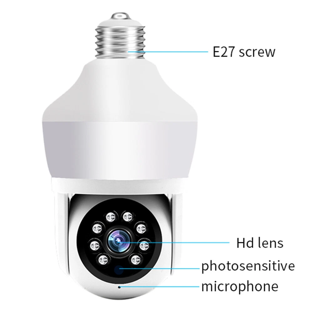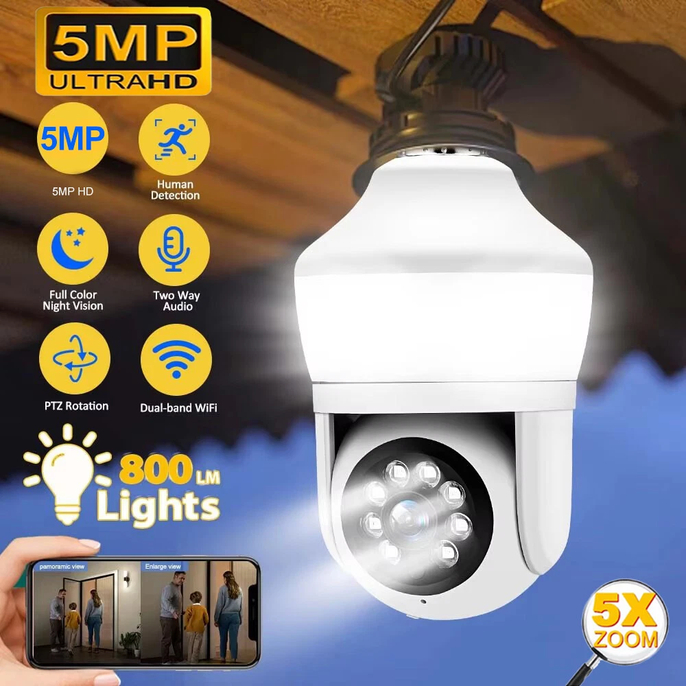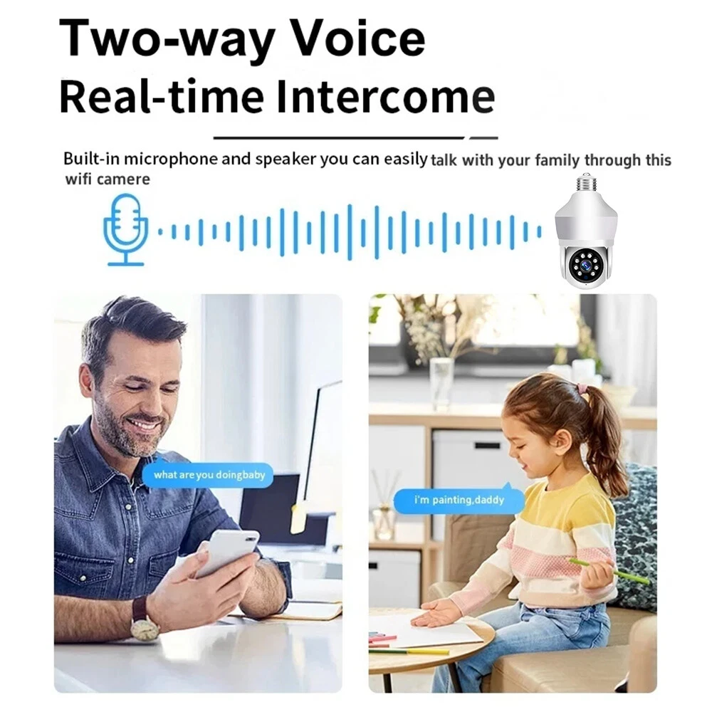 Features: * Remote control: monitor the smart bulb wifi camera anytime and anywhere via APP * LED bulb: the panoramic camera bulb can be turned on or off automatically, manually, and periodically. * HD 5MP: 5 megapixel high quality video clips provide clear and detailed images. * Wifi Connection: light bulb camera supports connection via wifi. (Only support 2.4Ghz router) * Alarm function: when the bulb camera detects someone entering the shooting area in time, it will push an alarm notification to your mobile phone. * Two-way audio: with built-in microphone and speaker, you can talk to others through the camera. * Pan & Tilt: control the rotation to any corner you want to check in APP, protect your home security. * Dual light source night vision: built-in 4 white LEDs and 4 infrared LEDs, you can see clear images even in complete darkness, support full colour night vision. Specification: Product name: WiFi camera Camera type: bulb Lens Pixel: 5MP Video compression: H.265 Camera lens: 3.6mm Waterproof rating: IP66 Sensor: CMOS Recording Mode: All Day and Event Recording Number of light beads: 4 IR + 4 white light. Network support: P2P mode, 2.4Ghz wireless Memory Expansion: 128GB micro SD card (not included) Rotation Angle: 355°(Horizontal)/90°(Vertical) Alarm Trigger: Video push, speaker alarm, alarm recording Applicable places: home, shop, school, supermarket, factory, etc Installation: Embedded Cloud Storage: Subscription required Apps: v380pro Compatible devices: Android/ios Working power supply: 110-240V Base type: E27 Product size: about 155*95mm Product colour: white Product material: ABS Packing list: 1* Light bulb camera (not including TF card) 1* E27 base 1* User manual 1* Screw kit Attention: 1. TF card in the photo is not included! 2. Colour may vary according to the light! 3. Please allow a slight 1-2cm difference due to manual measurement! 4. Thank you for your understanding and attention, wish you have a pleasant shopping experience! On Nov 18, 2024 at 04:35:43 PST, seller added the following information: