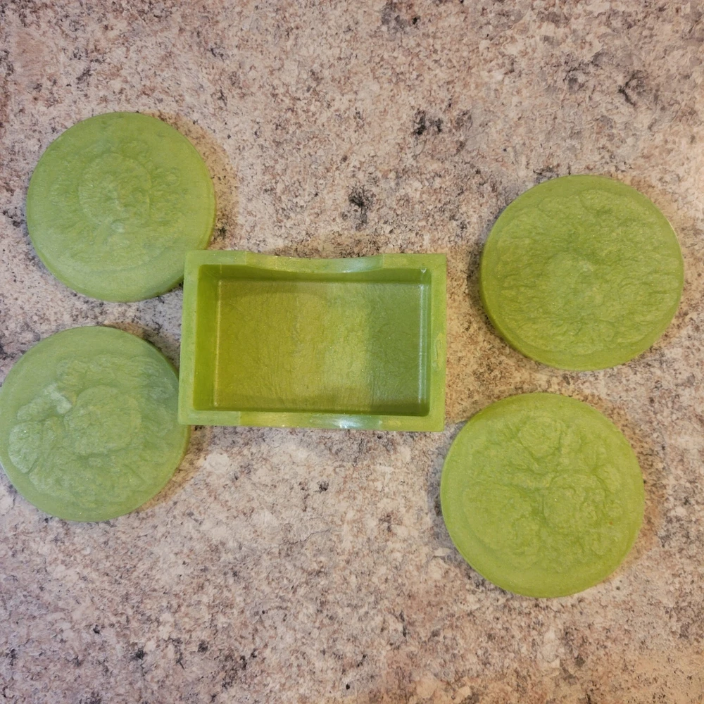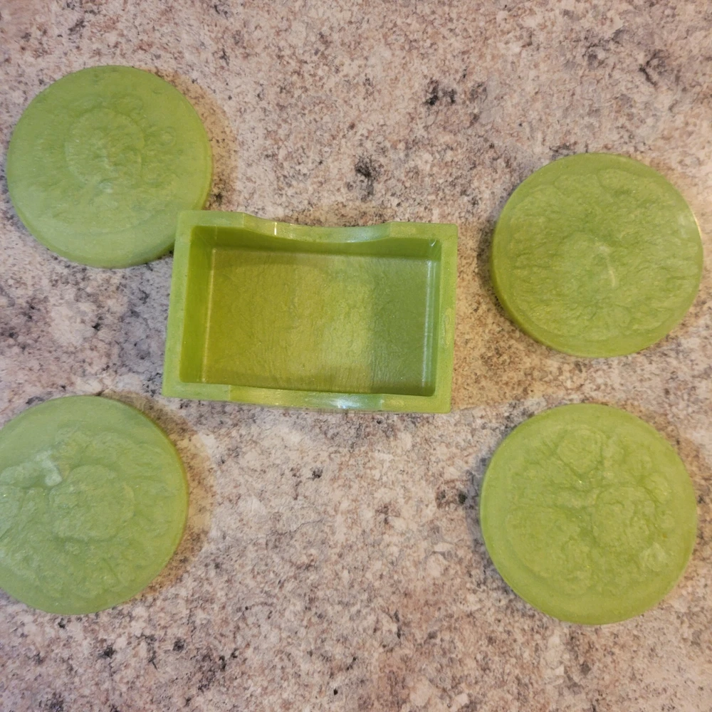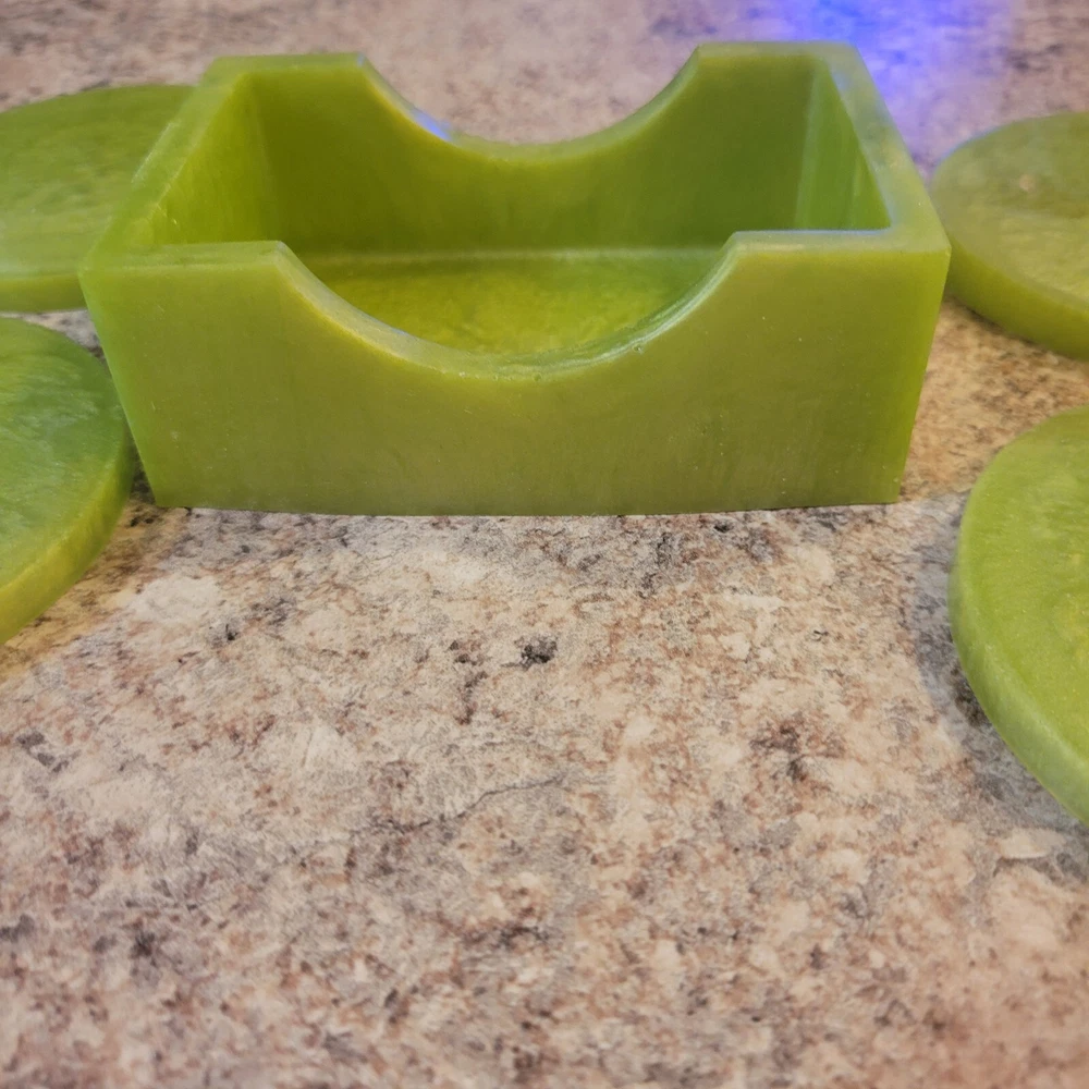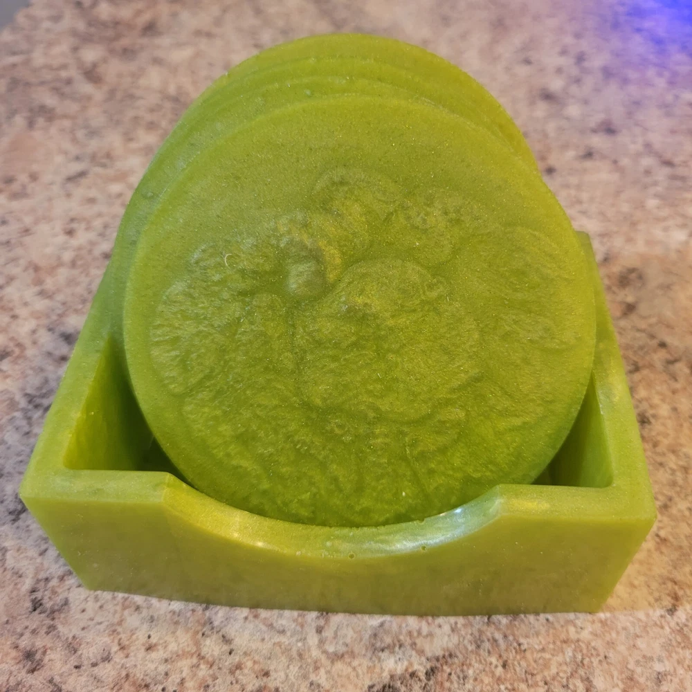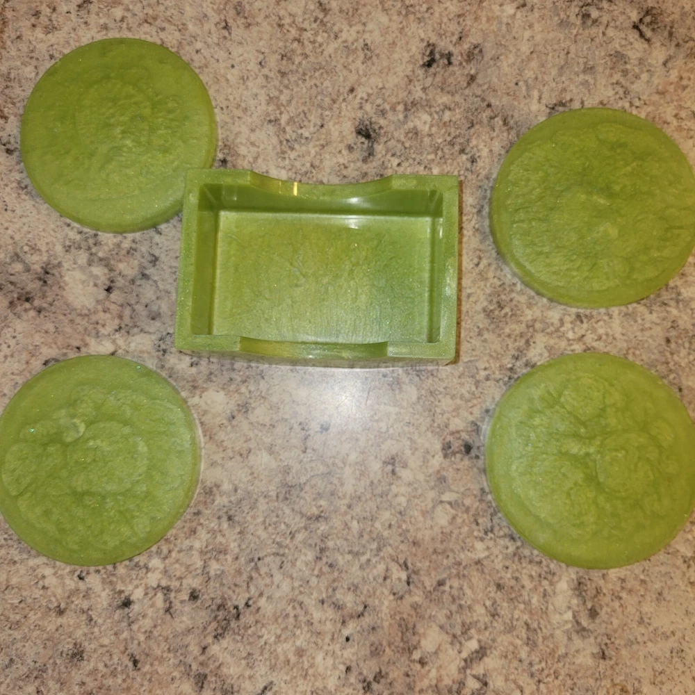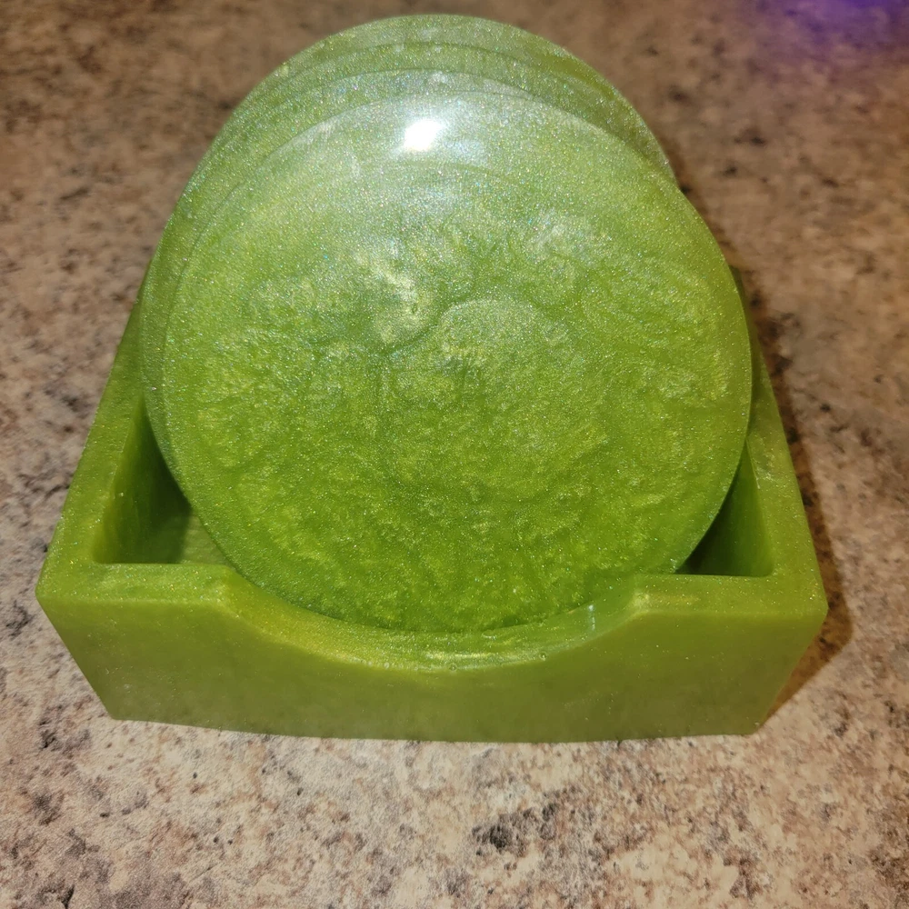 Light Green Resin Coaster Set with Holder - Handmade 4-Piece Coaster Set Add a touch of elegance to your space with this handmade light green resin coaster set. Includes 4 stylish coasters and a matching holder, perfect for protecting surfaces while enhancing your decor. Ideal for home, office, or as a unique gift.