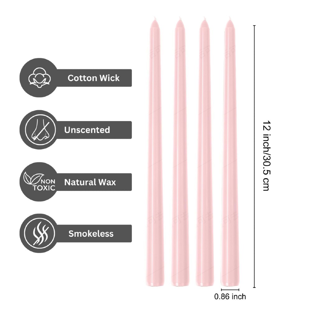 These light pink taper candles are absolutely stunning! The color is solid all the way through, giving them a rich, elegant look. Perfect for weddings, home decor, or as a centerpiece—they burn cleanly with minimal smoke. The 12" height and 3/4" diameter make them ideal for candlesticks or holders. Love that they're unscented and non-toxic too! Highly recommend for anyone wanting a touch of class.
