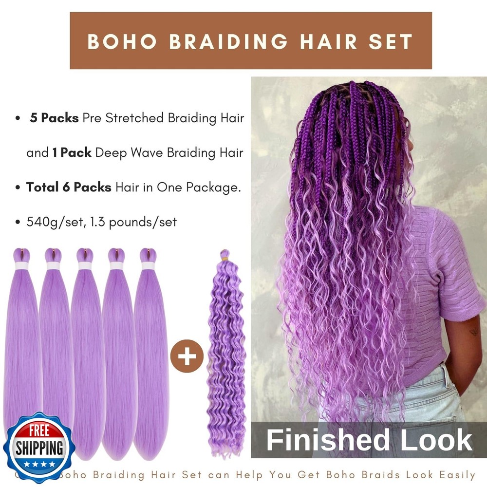 Light Purple Boho Braiding Hair Pre Stretched Knotless Boho Braids Hair Synthetic Deep Wave Crochet Hair for Women(6 Packs) Features Light Purple Boho Braiding Hair, There are 5 Packs Pre Stretched Braiding Hair and 1 Pack Deep Wave Boho Braiding Hair , Total 6 Packs Hair in One Package. The Synthetic Boho Hair Is Made With Quality Low Temperature Fibers, No Weft, Soft to Braid The Boho Braiding Hair Is Soft and Natural, Light Weight to Wear, the Colour Is Fade-resistant and Long-Lasting, Help You Get Charming Boho Braids Look Easily. Easy to Manage, Easy to Braid, Perfect for DIY Boho Braids, Goddess Braids,Knotless Box Braids, Ghana Braids or Creating Intricate or Elaborate Braided Styles. You Will Feel Amazing with the Gozill Synthetic Boho Braiding Hair Set, Try It Now Shipping Free & Fast Shipping: We offer free shipping to most of the USA with a normal delivery time of 3-7 days. However, due to the current situation, additional delivery time (up to 3 weeks) may be required for some items. Alternative Carriers: We may use alternative carriers (e.g., USPS, FedEx, UPS) to ensure your package arrives safely and on time. Due to the use of multiple carriers, we are unable to provide a tracking number automatically. Handling Time: Orders are processed and shipped within 1-2 business days of receiving cleared payment. Shipping Restrictions: Shipping to Alaska, Hawaii, Puerto Rico, Guam, and other US territories may incur shipping charges or delivery restrictions. Please contact us before ordering, or your order can be refunded/cancelled. State Restrictions: Certain items may not be shipped to California due to state regulations. Contact for Tracking Updates: If you require tracking updates or have any concerns about the delivery of your order, please feel free to contact us, and we will be happy to assist you. Return Policy 30-Day Hassle-Free Returns: If you are not completely satisfied with your purchase, you can return the item for free within 30 days of receiving it for a full refund or exchange. Easy Return Process: Contact us, and we will provide you with a prepaid return shipping label and detailed instructions. No Restocking Fee: There are no restocking fees for returns. However, the buyer is responsible for return shipping costs if the return is not due to a seller"s error. Refund Processing: Refunds will be processed within 1 business day of receiving the returned item in its original condition. Feedback Your feedback is extremely important to us. We strive to provide the best products and customer service possible. If you are satisfied with your purchase, please take a moment to leave us a positive review. If you have any concerns or issues with your order, please contact us before leaving negative feedback. We are committed to resolving any problems and ensuring your satisfaction. Contact Us If you have any questions or concerns, please feel free to reach out to our customer support team. You can contact us through the eBay messaging system. We are available Monday to Friday, 9:00 am to 5:00 pm EST, and we will do our best to respond to your inquiry within 24 hours. Thank you for supporting our small family business!