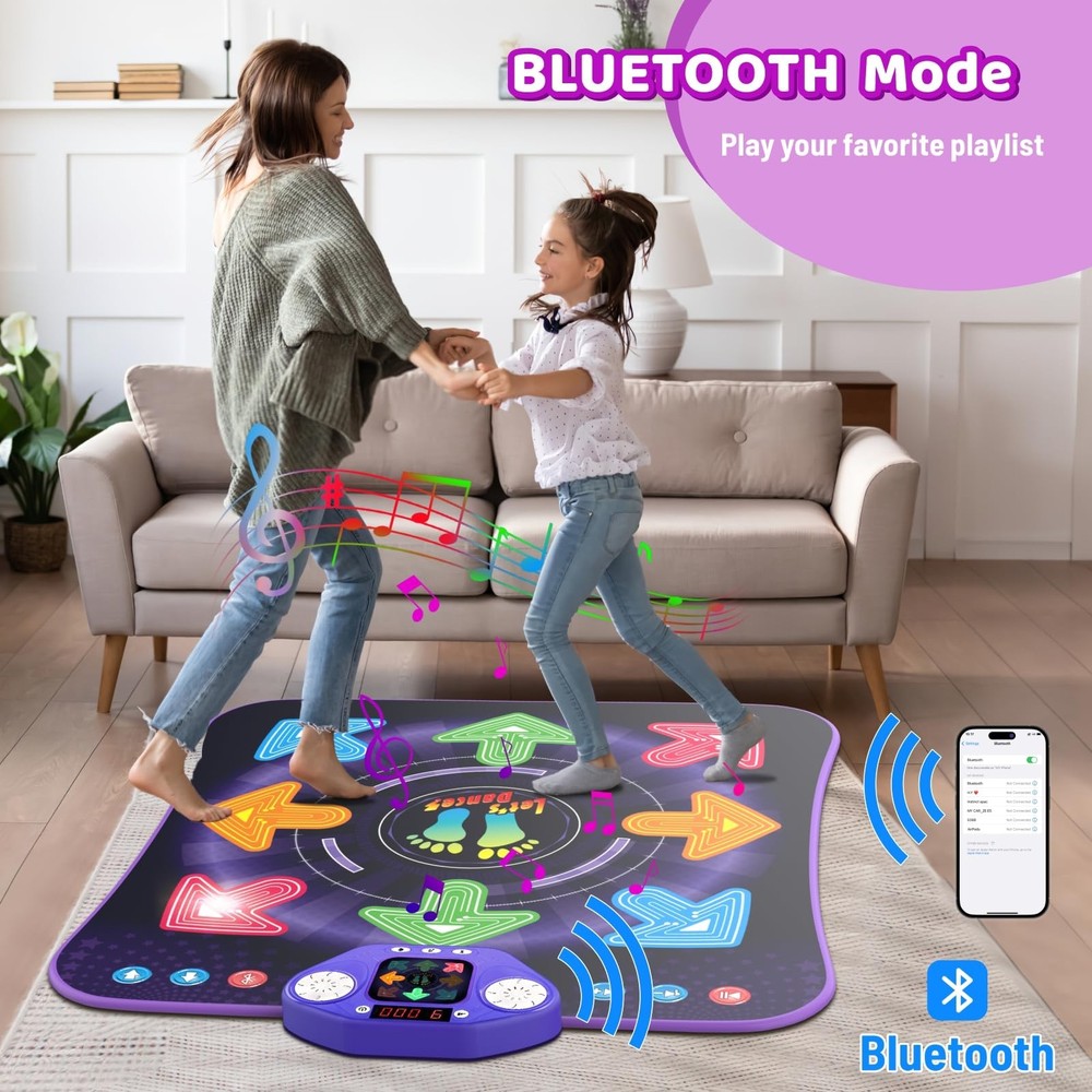 8 buttons light up dance mat for kids toys for 3-5 4-7 8-12 years old girls boys Light-up 8-Key Dance Mat: Let your kids dance better on the light-up dance mat! The newest 8-key mode design, flashing arrows and trampling sound enhances the entertainment of this dance mat. The shining arrows keys are more guiding and interactive to use, and can also improve kids' hand and foot coordination. Ideal gifts for girls 3-5 4-6 6-8 9+. 7 Games Modes Options: The dance mat toy can let kids keep active and off the couch and away from the tv or iPad. With light-up 8- button, keys trampling sound and 7 challenge modes (4 Games Mode & 3 Levels difficulty) that can attract kid’s attention. kids can step on the mat follow the tempo points, that way children can learn and develop a sense of musical rhythm and also an exercise artifact to enhance kids' movement! Dancing / Bluetooth / Memory Function: Dancing Mode--Girls dance follow the floor mat from easy to hard mode, 1-9 levels challenge. Bluetooth Mode--To play your favorite tracks via BLUETOOTH, be your own master and enjoy the funny of dancing hours. Memory Mode--Just follow the light-up button to copy step. Help body exercise and memory development while exercising in the funniest way possible. Unique Built-in 8 Nursery Rhymes: Press the music mode button, it can automatically play nursery rhymes, and children can dance along while learning the music, helping to inspire children's brain development. It does not require the help of adults and is more conducive to children's independent growth. Non-Slip & Safe Material: Kids dance mat is made of thick vinyl and it will hold up well, can be wiped off with a damp rag to clean. The dance mat have slip resistant at the bottom so it won't slide on any type of ground. If you're looking for a creative gift for your girls or boys, recommend this dance mat! Dance pad with multi-functions gameplay, suitable for kids age 3 4 5 6 7 8 9 10+ years old girls boys! Great Gifts for Your Kids: This Bluetooth dance mat allows kids to improve their hand and foot coordination by touching and stepping on it and to help identity pattern and colors, great for coordination and quick thinking skills. Great musical toys gifts for 3-5 6-8 8-12 12+years old girls that's trying to learn how to dance, recommend for kids who enjoy dancing/jumping.