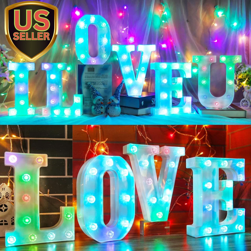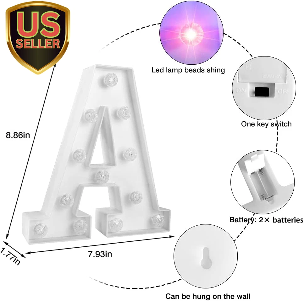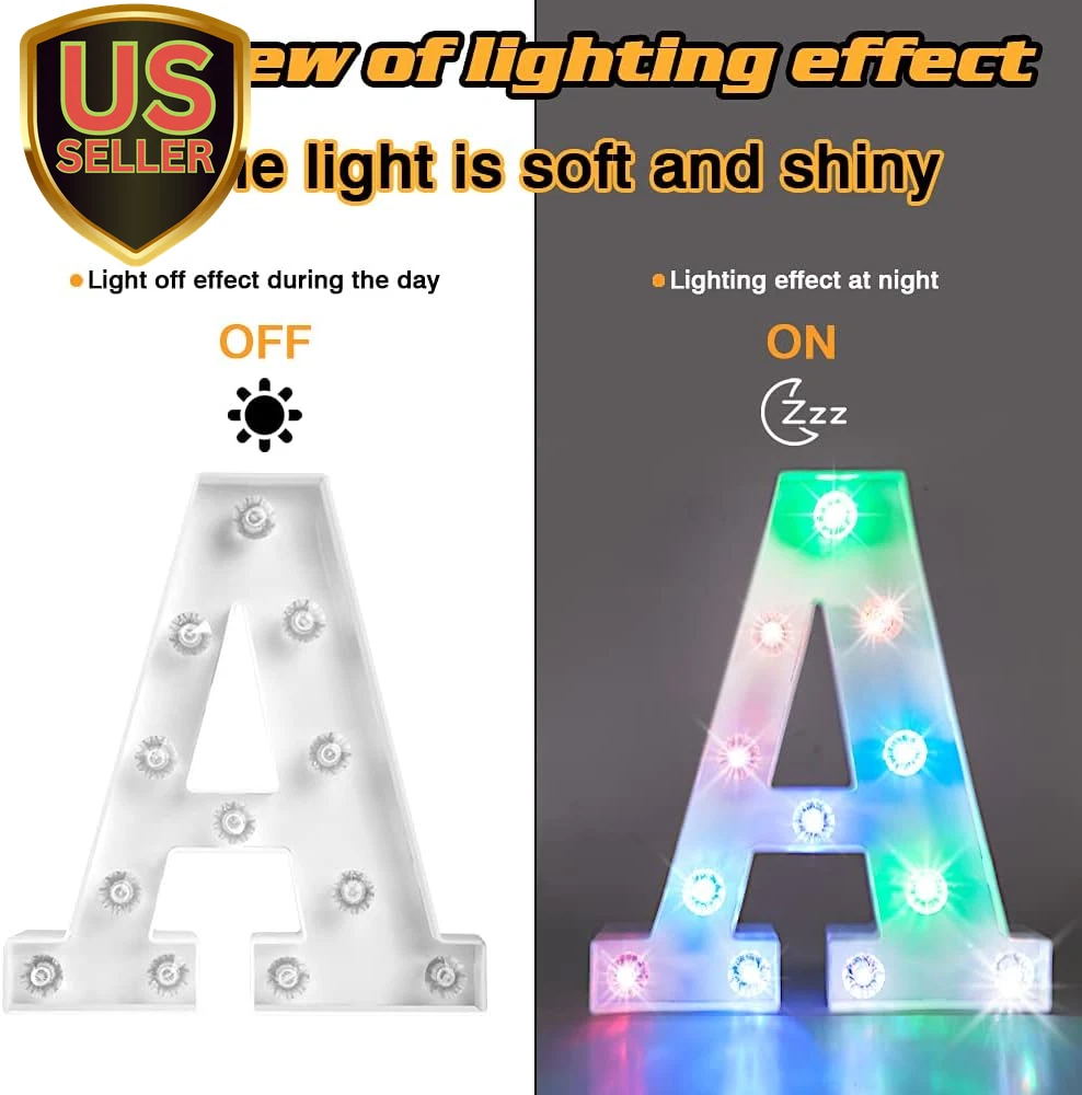Store New Arrivals Add to Favorite View Feedback Contact Light up Letters Letter Lights - Colorful LED Letters Lights Alphabet for Romantic Valentines Day Night Lights Wedding Birthday Party Home Bar Decor- (Colorful A) Description Light Source Type LED Item model number WP-1 Style Alphabet lamp-A Number of Items 26 Power Source Battery Powered Pattern Letter A Number of Light Sources 1 Control Method Touch Switch Type Touch Batteries Included? No Lighting Method LED Lamp Type Mood Light Number of Pieces 26 Room Type Office, Living, Bedroom, Nursery Finish Unfinished Installation Type Decoration Product Dimensions 1.85"D x 8.07"W x 8.8"H Material Plastic Efficiency High Finish Type Unfinished Specific Uses For Product Decoration Included Components Bulb Indoor/Outdoor Usage Indoor Bulb Base Flanged Water Resistance Level Not Water Resistant Batteries Required? Yes Item Weight 202 Milligrams Connectivity Technology IR Special Features No need for hand-held Special Feature No need for hand-held Shade Height 8.8 Inches Part Number WP-1 Mounting Type Free Standing, Wall Mount Color Alphabet lamp-A Is Cordless? Yes Base Material Plastic Shape Heart Voltage 3 Volts (DC) Recommended Uses For Product Decoration Shade Material Acrylonitrile Butadiene Styrene Size mini size 【Safety and Energy Saving】Made of advanced LED electronic device materials, non-toxic and durable quality materials designed to withstand heat and short circuits, making it ideal for safe manufacturing. No burns after long time use, safe to touch. No sharp parts, also suitable for children to use 【Less heat】LED is a more advanced cold light source, it is not like incandescent and fluorescent lamps like radiation a lot of infrared and ultraviolet light, almost no incandescent lamp like the current heat effect, will not be affected by thermal expansion and contraction. It will not lead to yellowing of the bulb, will not accelerate the aging of the lamp, and will not have a greenhouse effect on the surrounding environment 【Easy to use】Powered by 2 AA batteries (not included), no wires needed, when you put this light on a table, desk, shelf, it is the perfect accessory for your home. Also perfect for your nursery, office, gazebo and bedroom, suitable for wedding party, Christmas, New Year, birthday party, festival, bar decoration. etc 【Great Home Decor】 This letter light can be placed in the bedroom to add to the celebration, and it's ideal for parties when you put it in the living room and bring the bedroom to life. Also perfect for parties Light up your party with colorful letter lights to add atmosphere and excitement to the room 【Spell out imagination】 The 26 letters plus & numbers offer endless possibilities for creating messages. Spell out your favorite name or phrase with these beautiful light-up alphabets, such as "Bar" in a wine rack, "LOVE" at a wedding or add an acronym to a child's room Product Description Light up your house easy to place LED lights do not heat up after prolonged use. Plastic case, heat resistant and safe. The colorful LED diamond letter lights can also be displayed individually. home decoration Perfect combination of bright white panel and colorful lighting Definitely the ideal home decoration. There are switches behind each of the marquee letters that you can turn on for battery power wall decorations no big no small just right Every inch is perfect. During your party or celebration, the color changing letter lamp can be hung on the wall to give the room more atmosphere (with a keyhole slot on the back for easy hanging DIY Combination LED Decorative Lights Add Warm Atmosphere To Home And Parties decorative function Spell out any name or phrase you like with these beautiful glowing letters It can also be used as a climax to your weddings, parties, special events, etc. to grab everyone's attention. Portable and versatile Light up your favorite text on special occasions, events or home decor Perfect for home, birthday parties, outdoors, bar, cafe decor and more. High Quality - Made of non-toxic ABS+PP material, strong and beautiful and not too heavy DIY COMBINATION - 26 Alphanumeric Character LED Lights can be freely combined into Love you, U&M, HOME, MARRY ME, etc. Let your imagination run wild. bright colors No wires are required when you place this light on a table, or shelf. It is very convenient and you can put it anywhere you want without worrying about the power control Hole hook on back There are hooks behind each letter, you can easily hang them on the wall or place them on a table or elsewhere Battery powered Lights up with just 2 AA batteries Newest design Unlike the common letter lamp logo forms, this letter with the latest design logo is just as sparkly. Not only unique, but exquisite Vibrant colors Hole hook at the back ON/ OFF switch on the back. Diamond design