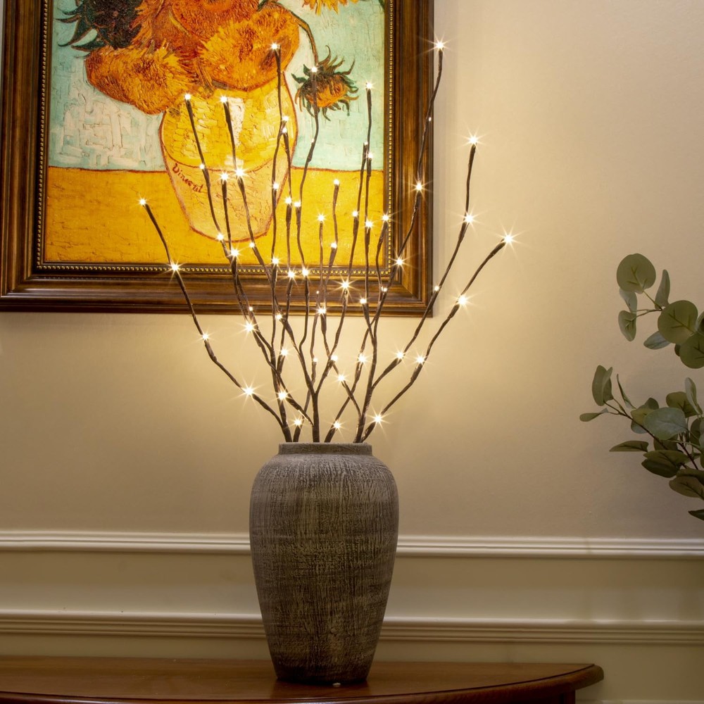 TWIG LIGHTS: Including 3PK branches, 3 ground stakes, and 1 UL plug, 60LT warm white light illuminates together, making people feel warm WILLOW BRANCH: Well-designed and made as an artwork, brown bark texture covered,which is more vivid and natural, Christmas decorations DIY GIFT: You can bend it a bit with little effort to create your own natural look UL CERTIFICATION: This Branch Lights has (12V 3.6W)UL approved plug in transformer and it is very safe during use HOME DECOR: Suitable for home indoor and outdoor decoration, equipped with 3 ground stakes that can be installed on courtyard paths to illuminate your way home; It can also be placed in a vase as a decorative light for Mother's Day, Father's Day, Birthday, Christmas, exhibition halls, galleries, and any room at home, creating a festive and eye-catching atmosphere