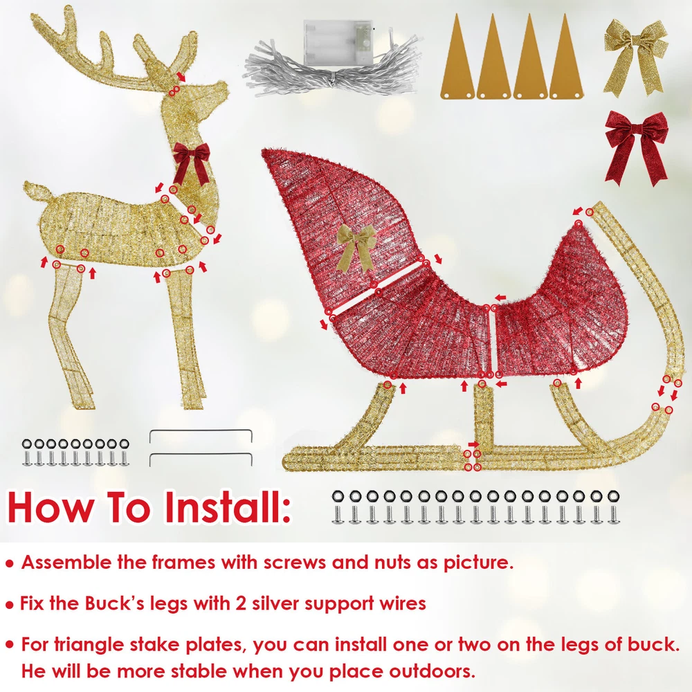 Reindeer and Santa sleigh are always the classic element in Christmas. Our lighted Christmas reindeer and sleigh create a unique festive, captivating every guest that arrives. Adorned with bows and strings. Designed with 8 light modes for appealing lighted display. Easy to install. A perfect Christmas decoration for both indoor and outdoor use. Take them to attract your family, friends, neighbors’ attention and enjoy their praise! Feature: Merry Christmas: Reindeer and Santa sleigh are always the classic element in Christmas. The lighted Christmas reindeer and sleigh will add a charming to your holiday decor. With bow design and red & gold, the gentle and adorable sleigh creates a unique festive, captivating every guest that comes. 8 Lighting Modes: This sleigh and reindeer outdoor decoration comes with a 16.97ft string light, glowing up beautiful warm yellow lights. You can freely choose 8 lighting modes, including Combination, In Wave, Sequential, Slo Glo, Chasing/Flash, Slow Fade,Twinkle/Flash and Steady On. Brighten up your Christmas decor by creating an eye-catching lighted outdoor display in your yard or porch. Reusable Decoration: Unlike those disposable decorations, these lighted reindeer and sleigh are made of sturdy iron frame, moisture-proof, rustproof, wear-resistant. A reusable and appealing decoration for every Christmas! Easy To Install: All needed tools is in the package. Just follow the detailed instruction, you can quickly install these lovely Christmas reindeer and sleigh. Indoor & Outdoor Display: A perfect Christmas decoration for both indoor and outdoor use, suitable for party, office, living room, bedroom, garden, patio, yard, lawn and so on. Take them to attract your family, friends, neighbors’ attention and enjoy their praise! Specification: Product Type: Lighted Christmas Reindeer & Sleigh Color: Gold+Red Material: 304 Stainless Steel Support Plates+Iron Frame Power Supply: 3Pcs AA Batteries(Not Included) 8 Lighting Modes: Combination, In Wave, Sequential, Slo Glo, Chasing/Flash, Slow Fade,Twinkle/Flash, Steady On Light Color: Warm Yellow Distance Between 2 Beads: 10cm/3.94in Item Size & Weight: *Reindeer: 55.2x103cm/21.73x40.55in; 550g/1.21 lbs *Sleigh: 83x60cm/32.68x23.62in; 700g/1.54 lbs Package Size: 43*33*5cm/16.93*12.99*1.97in Package Weight: 1632g/3.6lbs PackageContents: 1× Reindeer 1×Sleigh 2×Bows 4× Triangle Stake Plates 1× Screwdriver 1 Bag×Screws & Nuts 1× User Manual