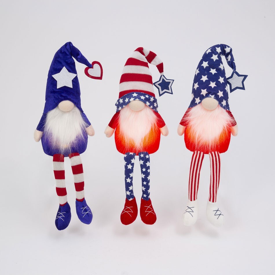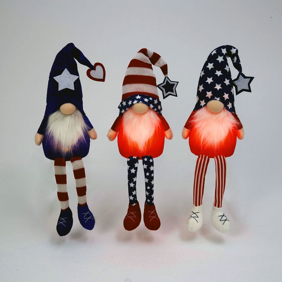 SET OF 3 GNOMES Set of 3 assorted plush battery operated Gnomes. 26.7 Inch Tall, sit them anywhere for a festive Holiday decoration. The body lights up Set of 3, Receive one of each style Requires 3 AAA batteries, not included. Made of fabric. Add a cute little gnome to your 4th of July or summer parties this year! Product Specifications SKU: #2582490 Size: 26.7" H Color: Red, White, Blue Type: Americana Gnomes Timer: 6 Hours Battery Size: 3 x AAA