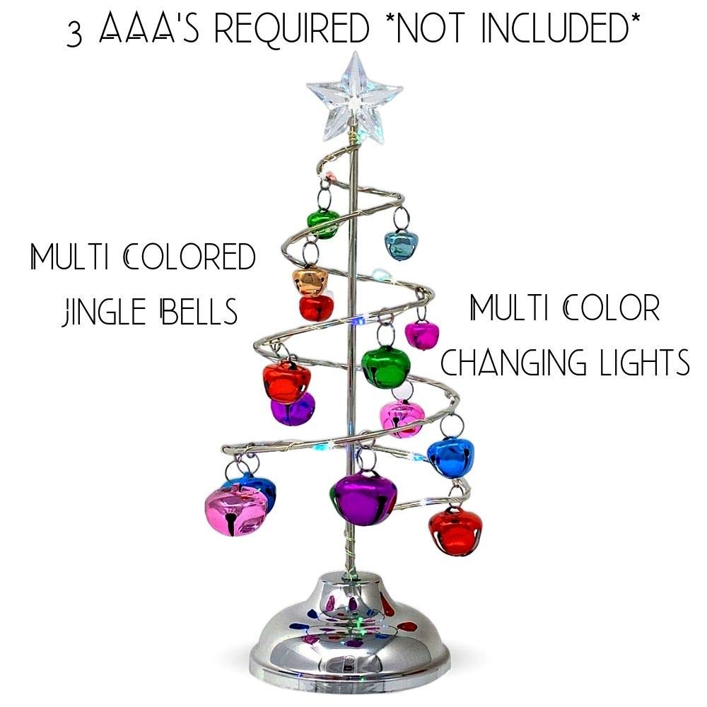 Light up, silver spiral wire tree with clear star on top. This cute tree is decorated with brightly colored jingle bells and a shiny silver base, approximately 4" W. Christmas tree with LED color changing rice lights wrapped around the tree. Measures approximately 10.25" H . Batteries required 3 AAA (NOT INCLUDED). This would make a great gift for anyone. Or add this to your home's holiday display or a perfect size for an office desktop décor. Get a few trees and add them to your mantle for a colorful holiday design. Planning a Christmas wedding or festive party these would be perfect on your tables! Light up Tree for holiday displays, desktops, office parties, Christmas centerpieces - LED lights strung around silver spiral wire tree. Approximately 10.25" H Christmas Figures lighted spiral tree for Christmas set up, holiday craft projects or Xmas centerpiece. Cute bright colored jingle bell tree with led rice lights wrapped around the wire tree. 3 AAA batteries required (NOT INCLUDED). Office Decoration or tabletop village display. Vivid color-changing lights will really illuminate your display. Accessories for Holiday - add them to your Christmas centerpieces or to the mantle for a colorful display. is a registered brand protected by Trademark and is distributed by Relevant Gifts.