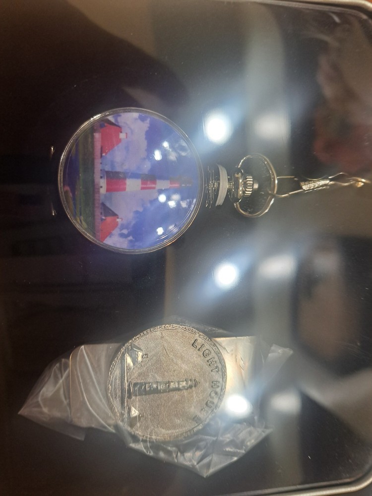 This Lighthouse Pocket Watch & Clip Holder in Silver Tone features a quartz movement and an open face closure. It is not water resistant and has a vintage style. The pocket watch comes with its original box/packaging and has a 12-hour dial. It is suitable for unisex adults and is made in China. This casual accessory combines practicality with a touch of nautical charm, perfect for everyday wear.
