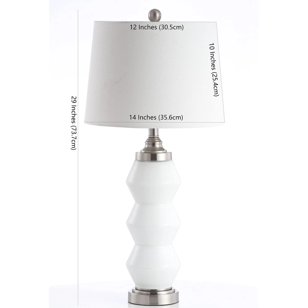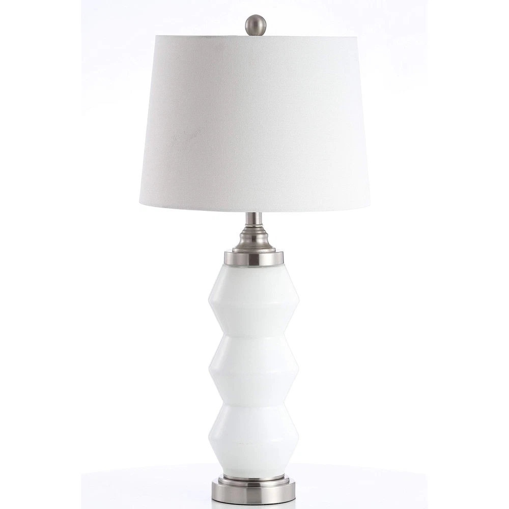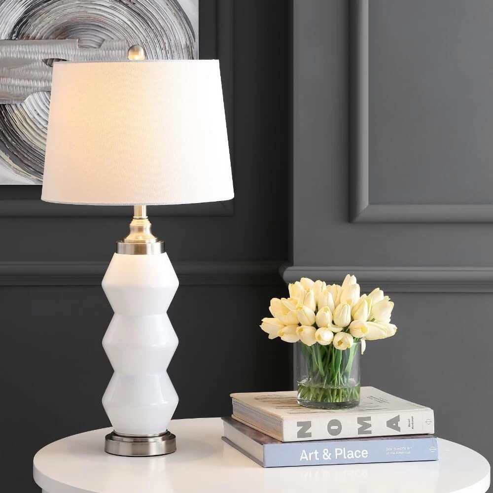 The dynamic sculpted style of this contemporary table lamp brings modern luxury to any room. Its bold white body features dramatic angles and a chic nickel finish on its base and finial. Its complementary cotton barrel shade creates a soft glow. Illuminate your living space with a stunning table lamp from 's lighting collection Features a bold white body with dramatic angles and a chic nickel finish on its base and finial LED bulb is included for convenience and added efficiency This table lamp works beautifully by the bedside on a nightstand, in the foyer on a console table, in the home office, living room, or dining area has been a trusted brand in home furnishings for over 100 years, providing quality craftsmanship and unmatched style