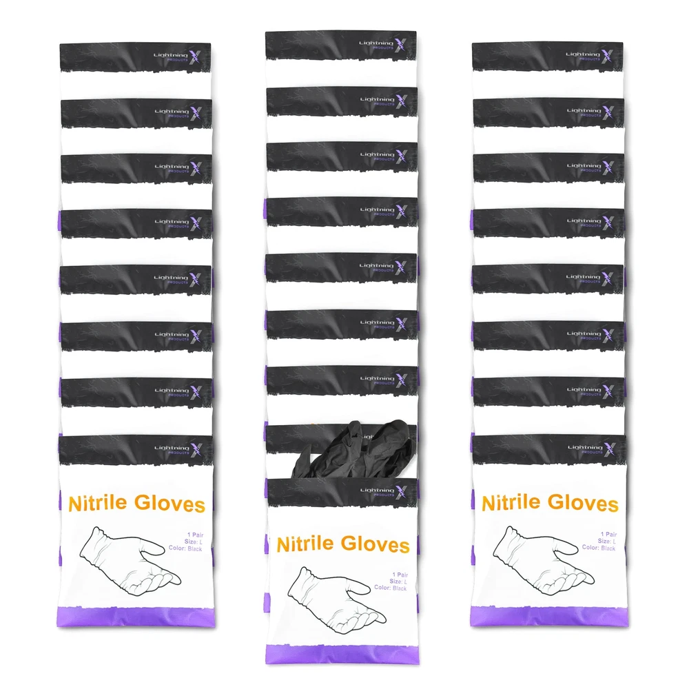 Description Lightning X medical grade Nitrile exam gloves - 25 packs of 1 pair (25 pairs, 50 gloves) individually packaged in resealable zippered poly bags. Smaller than a credit card and fits easily and unnoticeable in your pocket until you need them. Rugged Nitrile material is rip and puncture resistant and offers excellent dexterity, secure fit and ease of movement. The fingertips are lightly textured for a better grip. Our disposable nitrile gloves are ideal for those sensitive to rubber latex and deliver a comfort level rivaling that of latex. Great for first aid kits, stop the bleed kits, first responders, law enforcement, nurses, mechanics, food prep, custodians and more. Gloves are all size Large, which fit most users, and are considered food safe. Individually packed with 1 pair per bag Resealable zippered poly bag is smaller than a credit card Fits unnoticed in your pocket, wallet or first aid kit 25 packs of 1 pair, total of 50 gloves Size large fits most users