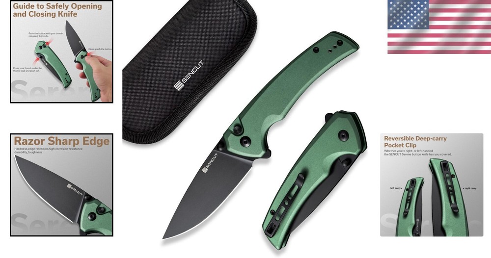 Blade Range: 2.76 - 4in. UPC: Does not apply Number of Blades: 1 Special Feature: Lightweight, Foldable, Locking Blades Blade Material: D2 Type: Pocketknife Item Length: 8.17 Inches Product Care Instructions: Hand Wash Only Color: Green Brand: Unbranded Lock Type: Button Lock gtin13: Does not apply Style: Manual Included Components: Storage Case Blade Shape: Flat Age Range (description): Adult Item Weight: 3.43 Ounces Handle Material: Aluminum Blade Edge: Plain Blade Length: 3.48 Inches Package Type: Ffp Opening Mechanism: Manual Blade Type: Drop Point, Sheepsfoot, Clip Point, Hawkbill, Karambit, Leaf, Needle Point, Pen, Spear Point, Spey Point, Straight Back, Tanto, Trailing Point, Wharncliffe Dexterity: Ambidextrous Hand Orientation: Ambidextrous