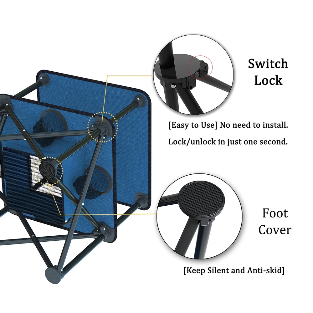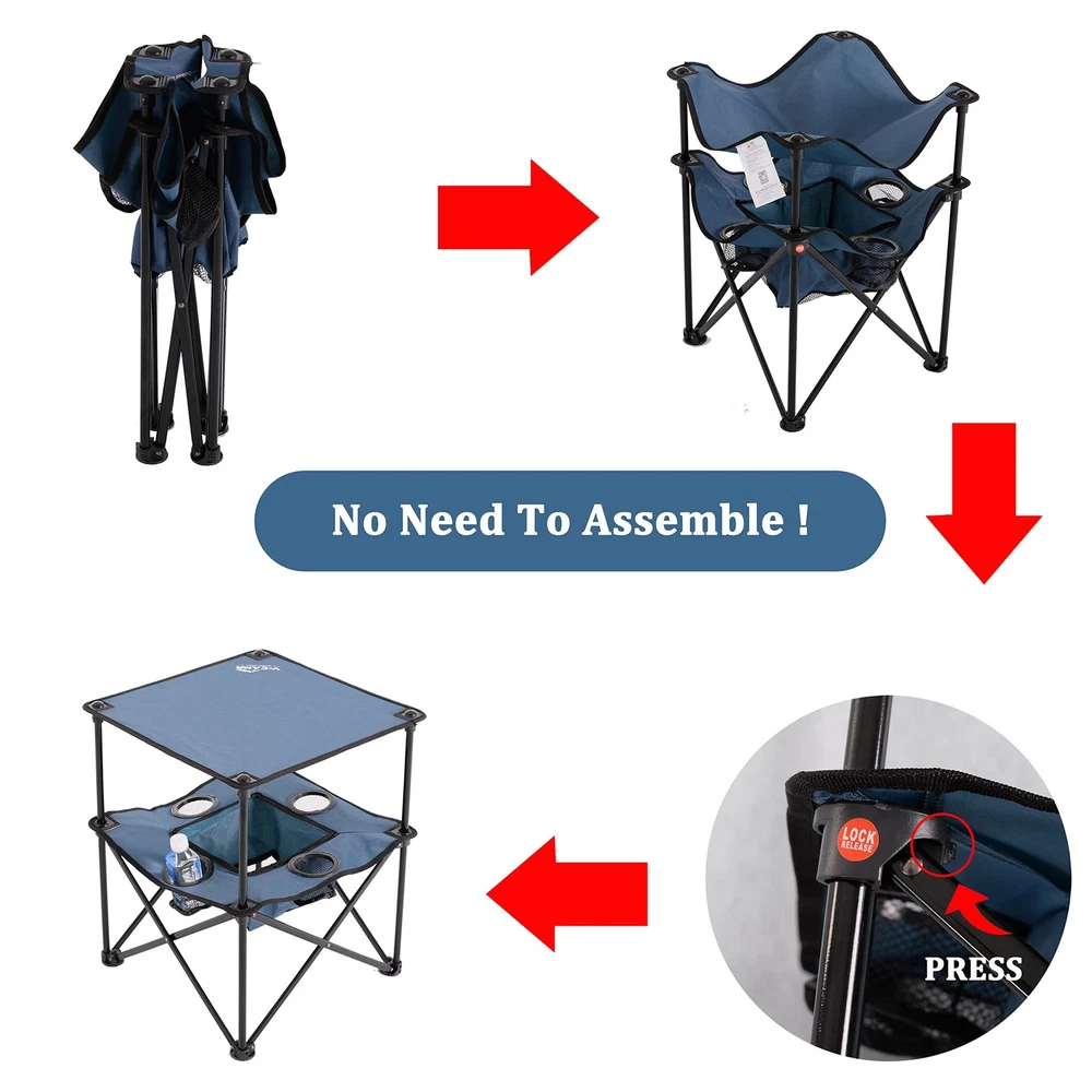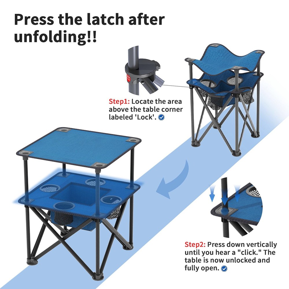 Folding Camping Table Portable Outdoor Camp Side Table Lightweight Square Picnic Table with Built-in 4 Cup Holders and Food Basket and Travel Bag for Barbeque Picnic Camping and Tailgate 【Indispensable Equipment】Camping table provides a place to drop your stuff when you tired——After a long hard day trekking you need a table that can take what you throw at it or enjoy a meal. 【Great Quality】Made with heavy-duty washable 600 denier canvas with sturdy metal frame. A unique safety buckle design ensures that the table top is tight and flat when unfolded, which can hold up to 35 pounds and will withstand anything you throw at it. Resists the elements with rust-proof legs and non-slip rubber leg caps so it stays stable in any terrain. 【Convenient Capacity】The second floor of this table has 4 cup holders at each corner, which securely hold your drinks and prevent spills. A large snack holder in the middle for a bowl of popcorn, chips, dip or other snacks, keys, etc, which makes snacking during outdoor activities easier and cleaner. At the top level of the table, there is another tier for extra space to hold food and games. Offers enough seating room for 4-6 people. 【Table in Bag】Unfolding size: 19''(L)*19''(W)*24''(H), but the package size is only 5.5''(L)*5.5''(W)*23''(H) and only weight 4.4lb. This patio table is portable and lightweight, comes with a compact carrying bag, and can easily to carried as a shoulder bag, which allows you to head outdoors and go further for longer ! 【Multi-Functional】 Foldable square canvas table is can not only be used indoors but also be used for camping, fishing, hiking, beach, picnic, BBQ, cooking and dining. In addition, you can also use this multifunctional folding table to put your laptop, play board games, or even serve as a bedside table. If you are not satisfied with the folding table for any reason, please feel free to contact us. 【Indispensable Equipment】Camping table provides a place to drop your stuff when you are tired——After a long hard day trekking you need a table that can take what you throw at it or enjoy a meal. In comes the folding table that combines unsurpassed beauty, mobility, and practicality without compromising its integrity! 【Great Quality】Our camp table is made with heavy-duty washable 600 denier canvas with a sturdy metal frame. The tabletop is tight and flat when unfolded, which can hold up to 35 pounds, and will withstand anything you throw at it. Resists the elements with rust-proof legs and non-slip rubber leg caps so it stays stable in any terrain. 【Convenient Capacity】The second floor of this table has 4 cup holders at each corner, which securely hold your drinks and prevent spills. A large snack holder in the middle for a bowl of popcorn, chips, dip or other snacks, keys, etc, which makes snacking during outdoor activities easier and cleaner. At the top level of the table, there is another tier for extra space to hold food and games. Offers enough seating room for 4-6 people. 【No Need to Install】Unfolding size: 19''(L)*19''(W)*24''(H), but the package size is only 5.5''(L)*5.5''(W)*23''(H) and only weight 4.4lb. This patio table is portable and lightweight, comes with a compact carrying bag and you can easily carry it as a shoulder bag, which allows you to head outdoors and go further for longer! 【Multi-Functional】 Foldable square canvas table can not only be used indoors but also for camping, fishing, hiking, beach, picnic, BBQ, cooking, and dining. In addition, you can also use this multifunctional folding table to put your laptop, play board games, or even serve as a bedside table. A switch lock makes the small table only take 1 second to fold up and no need to install, providing great convenience for your life.