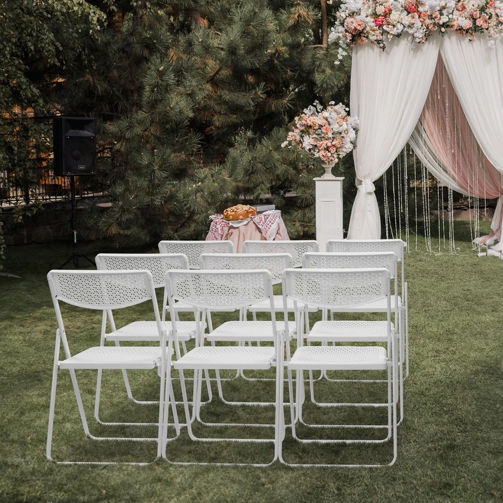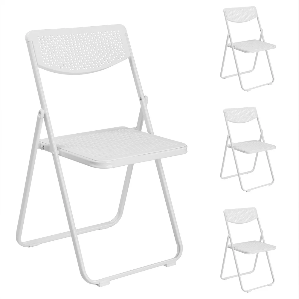 Introductions: Upgrade your seating solutions with our Plastic Folding Chairs. Designed for both comfort and convenience, these lightweight and stackable chairs are perfect for a variety of events, both indoors and outdoors. Featuring an ergonomic mesh seat and backrest, these chairs ensure maximum comfort for your guests. The folding design allows for easy storage and transport, making them an ideal choice for family gatherings, parties, weddings, and more. Features: 1. Exceptional Comfort: Each chair is equipped with a breathable mesh seat and backrest, providing maximum comfort and support for extended periods. The ergonomic design ensures your guests stay comfortable throughout any event. 2. Effortless Storage and Transport: The folding design allows the chair to open and close in seconds, making storage and transportation a breeze. Whether you're hosting a family gathering, going camping, or planning a celebration, these lightweight chairs are easy to carry and store. 3. Weather-Resistant Durability: Constructed from waterproof and moisture-proof resin material, these chairs offer-lasting use both indoors and outdoors. 4. Robust Triangular Structure: Engineered to meet the needs of different body shapes, these chairs provide outstanding stability and each chair supports up to 280 lbs. 5. Versatile and Stylish Design: With a simplistic modern appearance, these chairs enhance any setting. Perfect for decorating your garden, embellishing your balcony, or adding elegance to indoor and outdoor events like weddings and church functions. Specifications: 1. Material: PP, Iron 2. Color: White 3. Total Net Weight: 29.5 lbs / 13.4 kg 4. Single Chair Dimensions: (19.1 x 18.9 x 32.5) in / (48.5 x 48.0 x 82.5) cm Package Includes: 4 x Folding Chairs