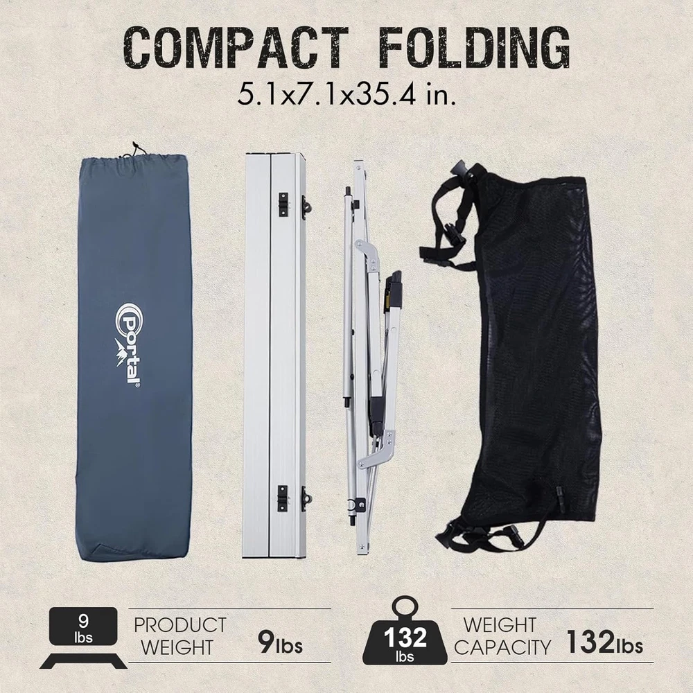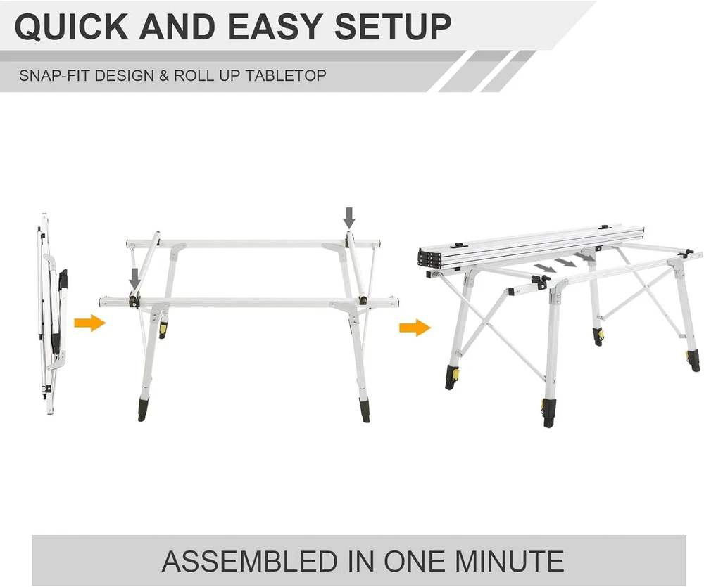 Adjustable Height: Portal folding table designed with telescoping aluminum legs for different heights starting at 17.7" to 27.5" to fit uneven surfaces and meet the demands for your next camping adventure Extra Storage Space: Mesh bottom layer provides more space and holds more stuff for you; it can be removed quickly from the 4 legs when you don't need Easy To Carry: The aluminum slat table top can be rolled up; legs are foldable with non-skid feet. Included carry bag makes the table extremely compact for easy storage and transportation Quick Setup: Assembly can be finished in 1 minute; the strength and stability will exceed your expectations; perfect for camping tailgating or backyard use Specifitions: Overall dimensions: 35.4'' L x20.9'' W x27.5'' H; folded dimensions: 7.1'' L x5.1'' W x35.4'' H; weight: 9 lbs(4.2 kg); Weight Capacity: 132 lbs(60 kg)