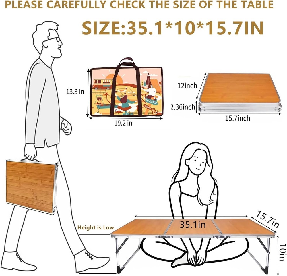 Base To Top Distance: 9.8 Inches Size: 35.5d X 16w X 9.8h In Collapsed Length Minimum: Set Includes: Table, Carrying Bag Color: Brown Frame Material Type: Aluminum UPC: Does not apply Seating Capacity: 4 Product Care Instructions: Wipe With Damp Cloth Tabletop Material: Aluminum Tabletop Thickness: 9.8 Inches Base: Aluminum Maximum Weight Recommendation: 120 Pounds Includes All Assembly Tools: No Table Design: Tray Table Suitable For: Camping, Hiking, Traveling, Fishing, Picnic, Beach, Backyard BBQ, Sporting Event, Tailgating Is Stain Resistant: Yes Handle Finish Type: Aluminum Item Width: 16 Inches Top Material Type: Aluminum Frame Material: Aluminum Features: Lightweight, Portable, Foldable, Compact, Scratch Resistant, Stable, Easy to Clean Item Dimensions D X W X H: 35.5"d X 16"w X 9.8"h Type: Camping Table Indoor Outdoor Usage: Outdoor Material Type: Aluminum Item Weight: 4.5 lbs Leg Style: Straight Leg Item Height: 9.8 Inches Age Range Description: Adult, Teen, Child (12+ ) Extended Length: 35.4 Inches Folded Dimensions: 17.6''x11.8''x2.3'' Ground To Item Distance: 9.8 Inches Included Components: Carrying Bag Weight Capacity: 120 lb Brand: Unbranded Top Color: Brown Style Name: Modern gtin13: Does not apply Handle Color: Silver Shape: Rectangular Base Color: Brown Handle Material: Wood Furniture Finish: Aluminum