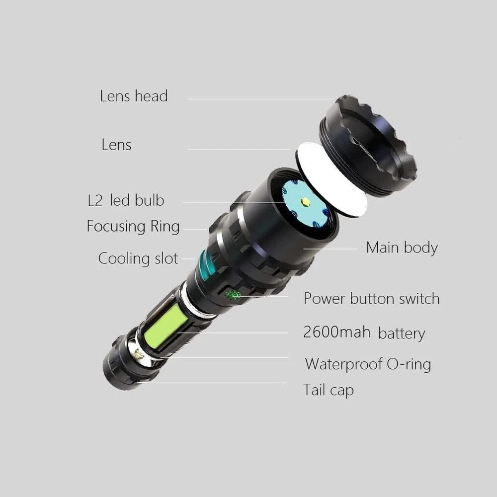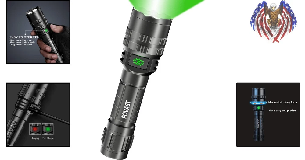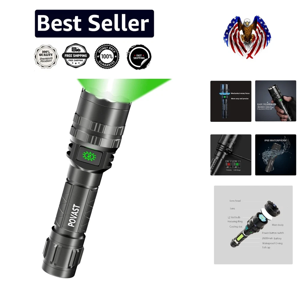 Features: Rechargeable, Zoomable, 5 Modes, Adjustable Focus, USB Charging, High Power Color: Green Batteries: 1 Lithium Ion Batteries Required. (included) IP Rating: Not specified Lumens: 1200 lumens Included Components: Battery Battery Cell Composition: Lithium Ion Recommended Uses For Product: Hunting Power Source: Battery Batteries Included?: Yes Operating Time: Not specified Wattage: 10 Watts Lighting Technology: LED Material: Aluminum Light Source Type: Led gtin13: Does not apply Specific Uses: Hunting Item Length: Rechargeable LED Flashlight Voltage: 5 volts (dc) Package Dimensions: 7.17 X 2.91 X 2.05 Inches Batteries Required?: Yes Personalize: No Item Height: Rechargeable LED Flashlight Battery Technology: Li-Ion Brightness: 1200 Lumen Battery Description: Lithium-ion Brand: Unbranded Number of Batteries: 1 Lithium Ion Batteries Required. (included) Number of LEDs: 1 Operating Range: Not specified Type: Flashlight Light Direction: Adjustable Number of Lights: 1 Finish Types: Green Item Weight: 8 ounces UPC: Does not apply Finish Type: Green