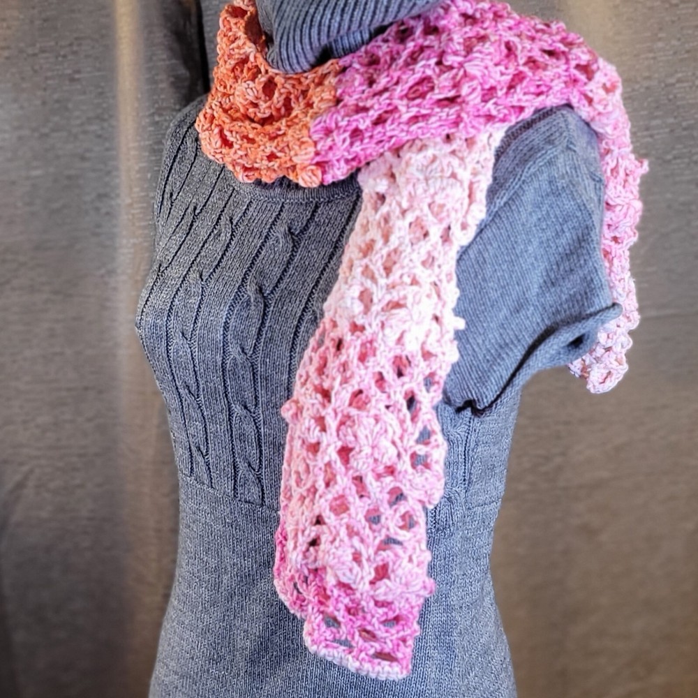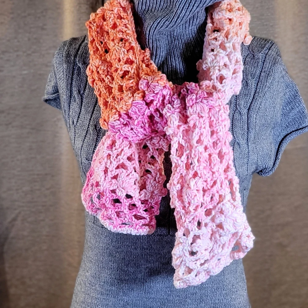This airy scarf is also the perfect wrap or pool side sarong! Handmade crochet in a large-scale flower and mesh lace pattern, this piece is crafted from variegated pink-orange-white acrylic blend yarn. This Scarf measures about 17 inches wide by about 53 inches long (over 1 foot by over 4 feet). Lightweight for year-round use- winter scarf, summer wrap, anytime wardrobe accessory! Ready-to-Ship, Free USPS Ground Advantage. International & Expedited shipping are available; please contact me to arrange (buyer pays in full). Due to the handcrafted, 1-of-a-kind, “imperfectly unique” nature of this item, all sales are final & returns are not accepted. Confirm sizes & color prior to placing order; feel free to contact me if you have questions! 15% of purchases of $15 or more - just add to your cart! Thank you for looking!