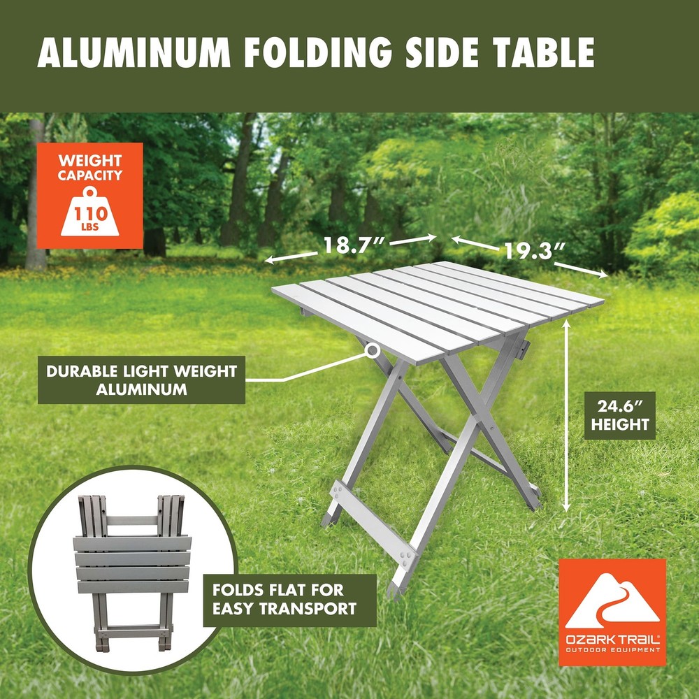 Aluminum Top Folding Table on your outdoor journeys for a convenient dining experience. Whether it's snacks or a full meal, this table is perfect for camping, tailgating, picnics, and more. With a compact and lightweight design, it's easy to carry anywhere and convenient to store in its half-folded size. Ideal for making memories during backyard campouts, riverside Saturdays with friends, or a solitary week in the wilderness. Great for camping, picnics, tailgating, backyard, and more Lightweight and rust-resistant The camping folding table is made of aluminum Folds in half size for easy storage Weight of table: 4.9 lbs Dimensions: 19.29" L x 18.7" W x 24.6" H Weight capacity: 110 lbs