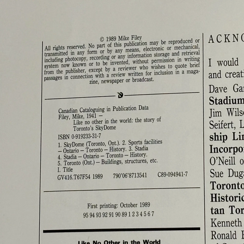 Delve into the fascinating history of Toronto's iconic Skydome with Mike Filey's captivating book, "Like No Other In The World: The Story of Toronto's Skydome." Published in 1989 by Sun Controlled Ventures, this hardcover first edition offers a comprehensive look at the engineering marvel and its significance in Canadian history. A must-have for history enthusiasts and collectors, the book is rich with illustrations that bring the narrative to life. Filey's meticulous research and engaging writing style make this book a unique addition to any library. As a vintage piece, it not only provides an informative read but also serves as a nostalgic trip down memory lane. Whether you're a resident of Toronto or an avid reader of historical accounts, this book is sure to impress.