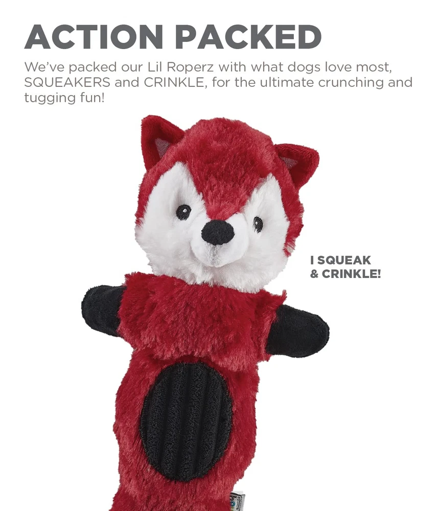 These cute critters will delight your dog with tons of tugging and silly sounds. Featuring squeak and crinkle sounds dogs love, rope handle and ultra durable material, these plush toys stand up to tough tugging play. Available in 3 cute characters - Hedgehog, Fox & Gator. SAFETY AND CARE: When choosing a toy, make sure to choose an appropriate size toy for your dog. No toy is indestructible. ALWAYS supervise your dog when using a toy of any kind. Inspect toys regularly for damage and remove and replace if broken, or if parts become separated, as serious injury may result. Intended for dogs only. Keep out of reach of children. CRINKLY & SQUEAKY DOG TOY: Lil Roperz from are a collection of plushy dog toys perfect for shaking and playing. A crinkle-filled body and inner squeaker are a fun and irresistible combination. K9 TUFF GUARD TECHNOLOGY: These adorable dog toys are made with K9 Tuff Guard Technology that features reinforced non-rip seams, ultra-durable fused backing, and double stitched seams to ensure longer-lasting fun! ULTIMATE TUGGING FUN: These cute critters will delight your dog with tons of tugging and silly sounds. Featuring squeak and crinkle sounds dogs love, rope handle and ultra-durable material, these plush toys stand up to tough tugging play. ACTION PACKED: We've packed our Lil Roperz with what dogs love most, SQUEAKERS and CRINKLE, for the ultimate crunching and tugging fun! THIS IS NOT A CHEW TOY: No toy is indestructible. Do not leave toys with unsupervised pets. Remove and replace toy if damaged.