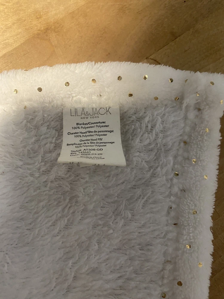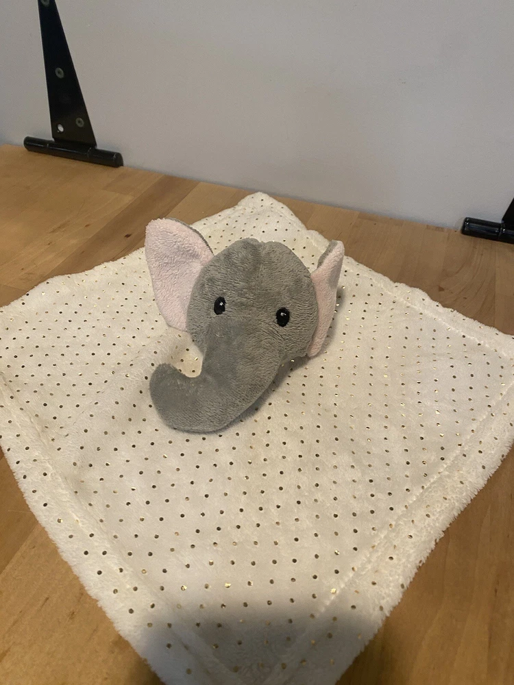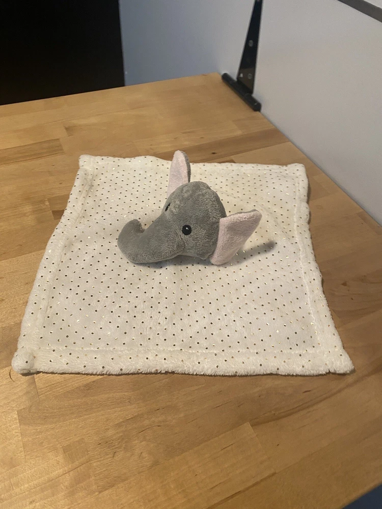 This Lila & Jack NY lovey security blanket is the perfect addition to your baby's collection. The white blanket with gold dots features an adorable elephant theme that is sure to delight your little one. Measuring at 12 inches, this blanket is soft and perfect for cuddling. It is suitable for babies and toddlers alike and makes for a great gift. The brand, Lila & Jack, is known for creating high-quality baby products, making this blanket a must-have for any parent or caregiver. In great condition, smoke free house