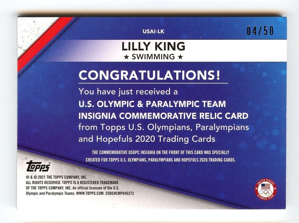 The product is a 2021 Topps U.S. Olympic Commemorative Insignia trading card featuring Lilly King, a gold medalist swimmer representing the USA. This card is a limited edition Silver Parallel with a print run of only 50 copies, making it a rare collectible for fans and collectors. The card is in Near Mint/Mint condition and includes a special commemorative insignia to honor Lilly King's achievements in swimming at the 2021 Olympics.