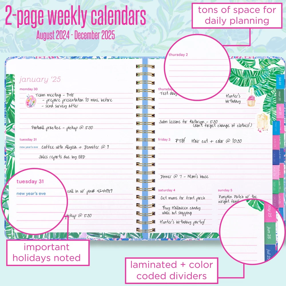 Lilly Pulitzer Daily Planner Dated August 2024 - December 2025, Weekly Agenda with Monthly Calendar, Stickers, Pockets, & Spiral Binding, Just A Pinch 2024-2025 Planner Weekly and Monthly: Agenda provides 17 months of coverage beginning in August 2024 and ending in December 2025; planner book includes 272 total pages and a printed hard cover with gold details Day Planner: Each weekly calendar has lined sections for planning out each day of the week; all weekly planner pages have the major holidays listed and tons of room for daily tasks and activities Monthly Calendars: Each month is divided by laminated tabs and includes a monthly calendar that has open boxes for each day, major holidays listed, and a lined “to do” column to set goals and write lists Planner Accessories: 24-25 planner features colorful stickers, a reinforced double-sided pocket page, durable gold metal spiral, and an elastic band closure. Plus, pages for notes, dates to celebrate, addresses, and travel journal Cute Planner: Date book is complete with hand painted art interiors and a sturdy hardcover that is printed in a vibrant Lilly Pulitzer pattern. Spiral planner measures 11.13 inches (28.3 cm) long by 8.63 inches (21.9 cm) wide (similar in size to a standard notebook) 2024-2025 Planner Weekly and Monthly: Agenda provides 17 months of coverage beginning in August 2024 and ending in December 2025; planner book includes 272 total pages and a printed hard cover with gold details Day Planner: Each weekly calendar has lined sections for planning out each day of the week; all weekly planner pages have the major holidays listed and tons of room for daily tasks and activities Monthly Calendars: Each month is divided by laminated tabs and includes a monthly calendar that has open boxes for each day, major holidays listed, and a lined “to do” column to set goals and write lists Planner Accessories: 24-25 planner features colorful stickers, a reinforced double-sided pocket page, durable gold metal spiral, and an elastic band closure. Plus, pages for notes, dates to celebrate, addresses, and travel journal Cute Planner: Date book is complete with hand painted art interiors and a sturdy hardcover that is printed in a vibrant Lilly Pulitzer pattern. Spiral planner measures 11.13 inches (28.3 cm) long by 8.63 inches (21.9 cm) wide (similar in size to a standard notebook) Shipping from the USA All of our products are shipped from the USA, ensuring quick delivery to your destination. Payment We offer the following payment methods: PayPal, credit card, bank transfer, and eBay's secure payment system. Free Shipping & Free Returns Shipping within the USA is FREE. Additionally, any return is absolutely free for you. Risk-Free Purchase You have the option to return an item within 30 days without any justification. We cover the return shipping costs! Fast Shipping We ship immediately upon receipt of payment. Generally, the package is delivered within 2-3 days in the USA. If it takes longer, we will contact you. Quality and Costs Made in Europe, USA, China No customs fees or additional charges Total satisfaction guarantee Invoice with declared VAT available upon request in .pdf format Feedback Your feedback is very important to us. After you pay for your purchase, you will automatically receive positive feedback from us.