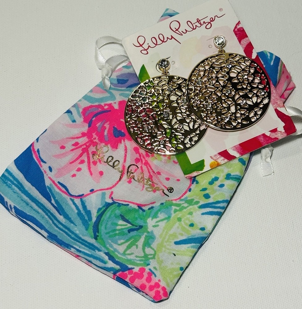 Elevate your style with these stunning Lilly Pulitzer Devine Gold Metallic Drop Earrings. The round white/colorless crystal stones are beautifully set in gold tone metal with intricate lace detailing. Includes a Lilly cloth pouch