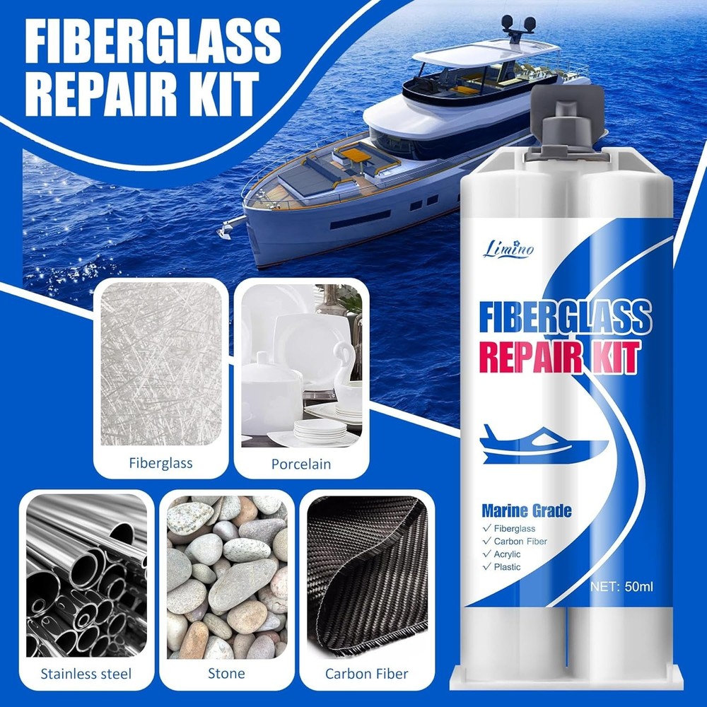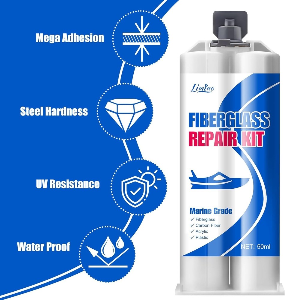 Limino Marine Fiberglass Repair Kit - 100ml Fiberglass Resin Filler for Fiberglass Bathtub Chips Cracks Holes Scratch Repair - Gel Coat Repair Kit for Boats, Jet Skis, Surf Boat, Kayak, UV-Resistant Product Description SPECIALIZED FIBERGRASS KIT - Our marine fiberglass repair kit has mega adhesion to effectively repair fiberglass boat damage on horizontal and vertical surfaces (Above The Waterline), perfectly repairing scratches, cracks and holes on the boat. Excellent UV resistance and waterproof protection, specially designed to cope with exposure to sunlight and humid environments, making it suitable for various types of boat repair tasks such as motorboats, surfing boats, kayaks, yachts, sailboats, canoes. VARIETY OF APPLICATIONS - The gelcoat repair kit has good compatibility with surface damage repair of fiberglass, carbon fiber, acrylic, plastic, porcelain, stainless steel, stone, aluminum and other materials. Not even for boat, if you encounter the above materials you need to repair in your life, use this product to started doing a bunch of small repairs around the house immediately. DURABLE AND LONG-LASTING QUALITY - We use two-component fiberglass filler for detachable open packaging, ensuring the activity of the product during storage and its reusability. With outstanding mega adhesion, it can ensure the perfect fit between the adhesive and the repaired wound, and maintain a steel like hardness and toughness for a long time. It is a perfect marine fiber glass simple repair kit. SIMPLY TO USE - The marine fiberglass repair kit equipped with complete accessories, we use the push rod to squeeze out A and B simultaneously into the silicone cup. After 30s mixing, start repairing and applying. The operational time is about 20 minutes (25℃). Fully curing time is 24 hours. When it solidifies, its hardness is as hard as steel. So we equipped sandpaper to polish the surface for better fusion effect. ECONOMICAL AND PRACTICAL - The same expenditure can achieve greater capacity without sacrificing quality. If you are not satisfied with your purchase or if it arrives damaged, don't hesitate to reach out to us. Click 'Add to Cart' now and enjoy the journey of perfect repair experience.