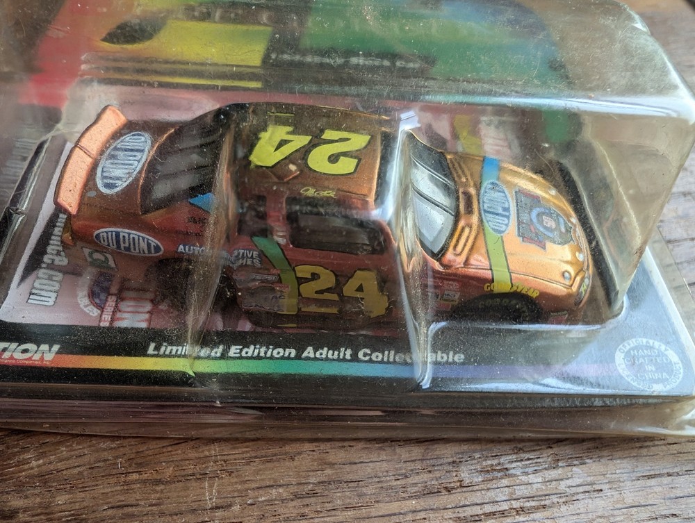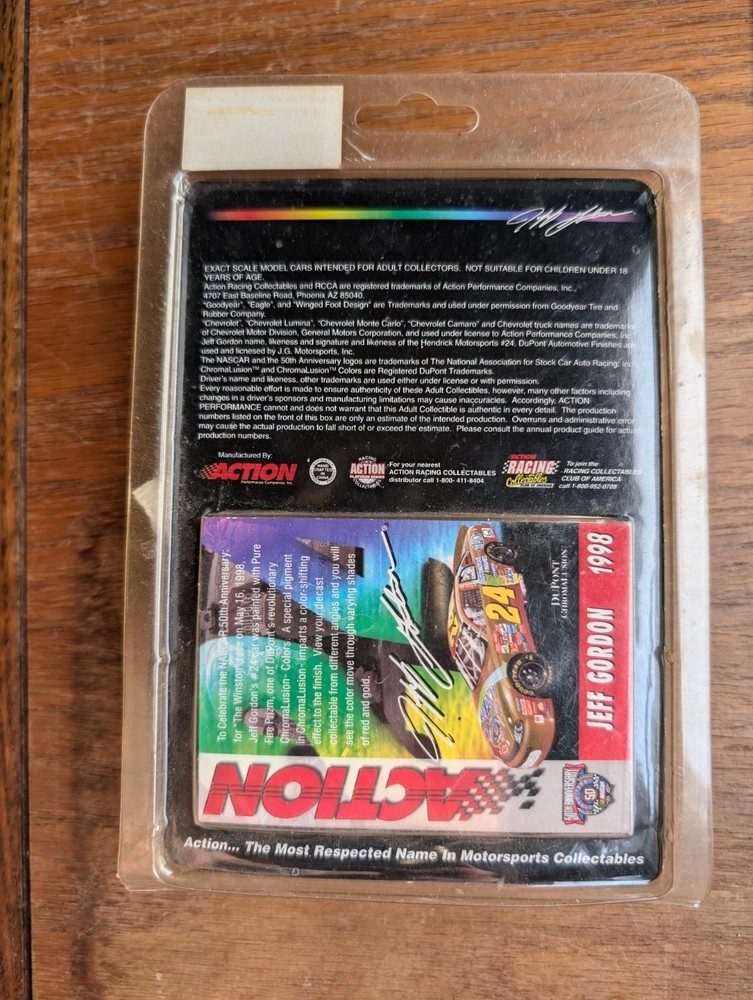 Limited Edition NASCAR 50th Anniversary Jeff Gordon Chevrolet Impala stock car, in original packaging. Regular where and tear on packaging due to long-term storage, unopened.