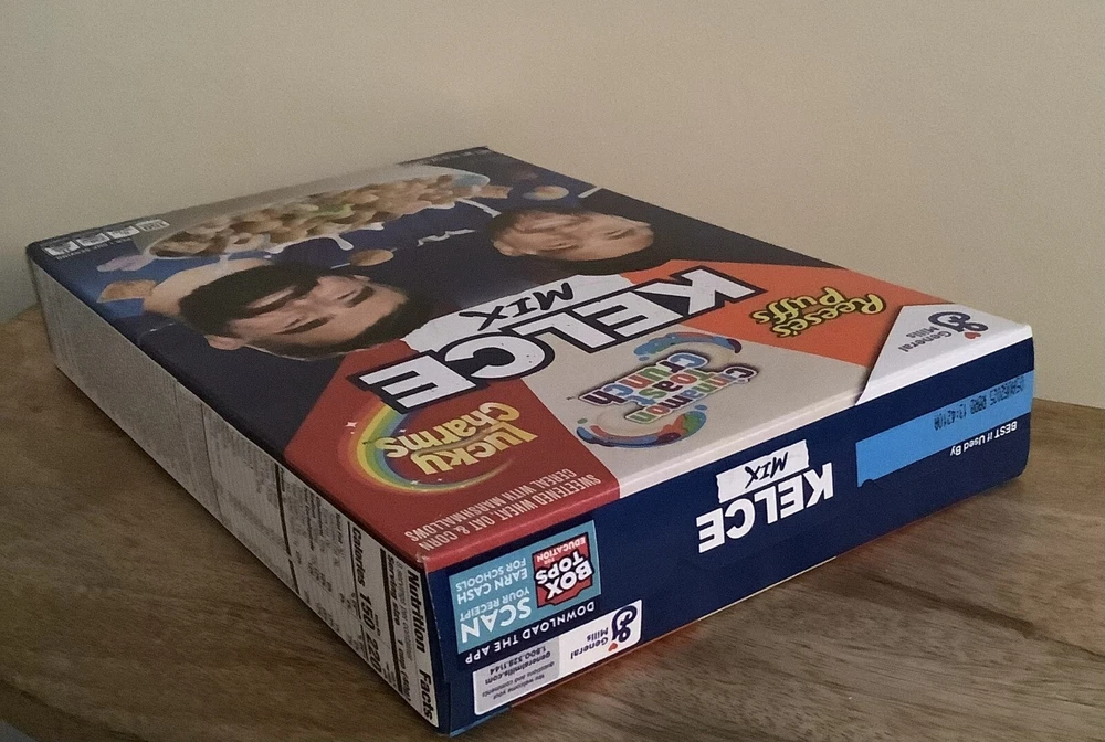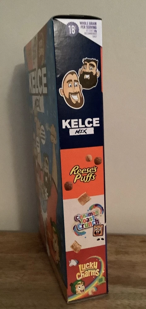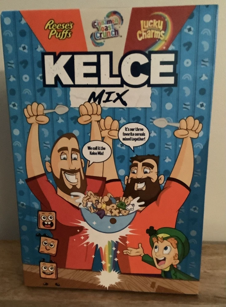 Limited Edition General Mills Kelce Mix Cereal featuring NFL powerhouse brothers Jason and Travis Kelce. Cereal is a combination of Reese's Puffs, Cinnamon Toast Crunch and Lucky Charms